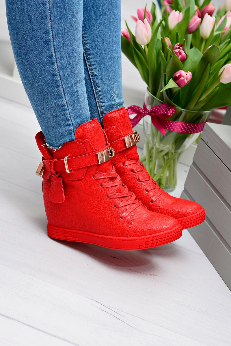 Damskie Czerwone Sneakersy Złota Kłódka Koturn Hudgens