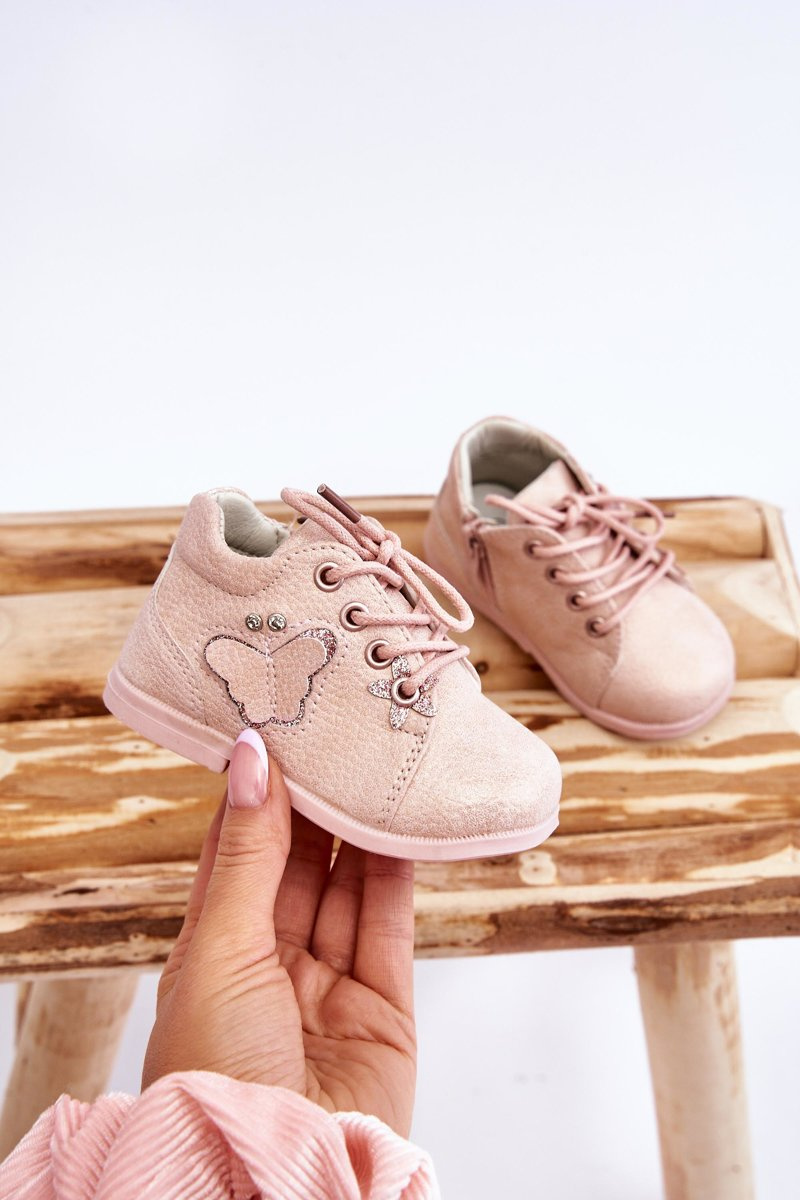 Skórzane Botki Sznurowane Z Motylkiem Różowe Avi