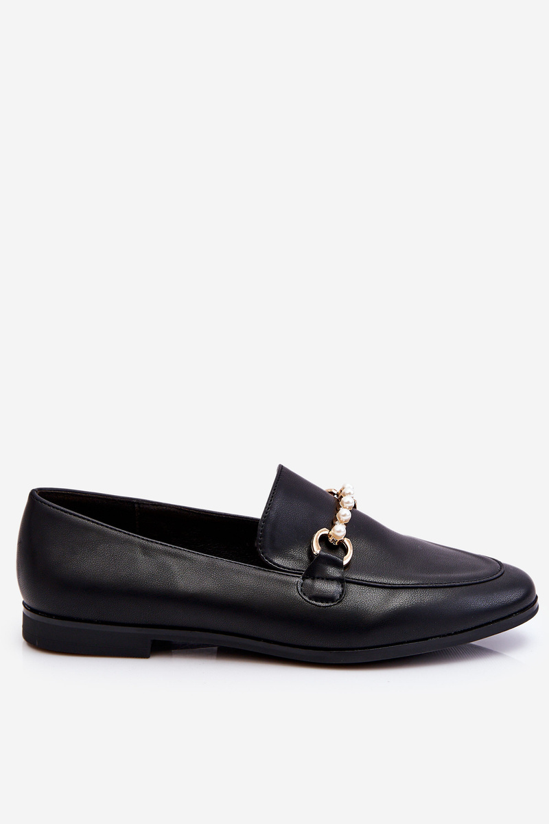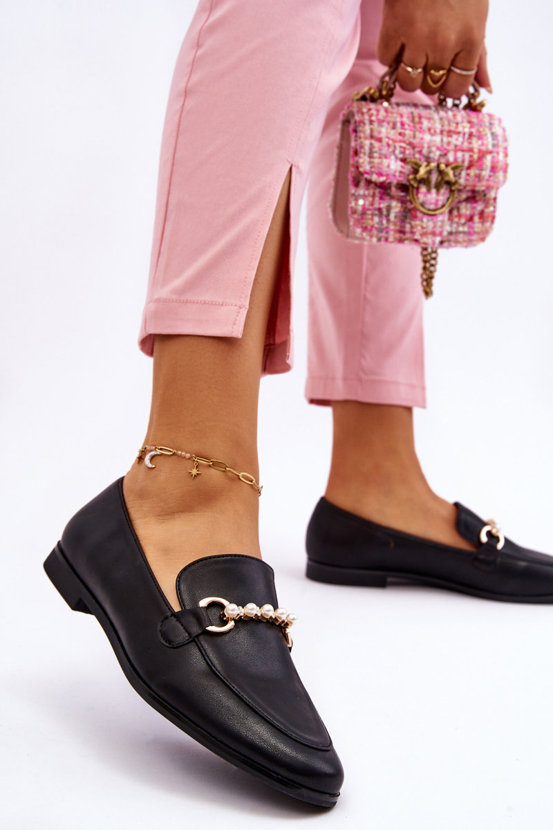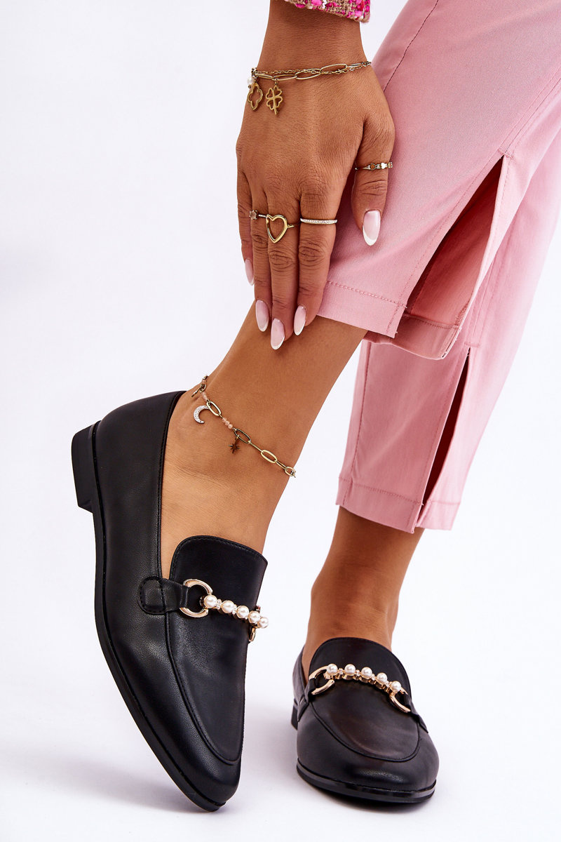 Damskie Skórzane Mokasyny Z Ozdobnymi Perełkami Czarne Ishan