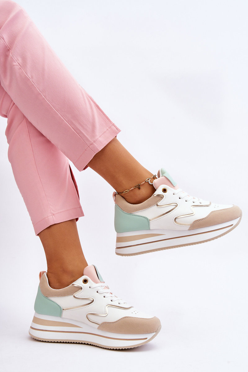 Modne buty sportowe o ciekawym fasonie zostały wykonane z eko skóry. Posiadają przy nosku delikatną perforację. Osadzone na platformie oraz delikatnym koturnie. Miękka wkładka została wykonana z materiału. Obuwie posiada klasyczne sznurowanie. Przy wyborze rozmiaru prosimy kierować się tabelą rozmiarów.