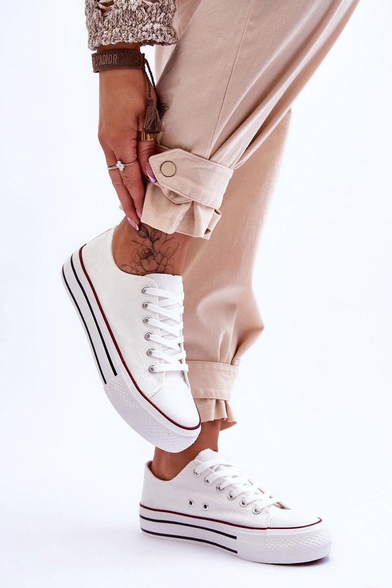 Damskie, klasyczne trampki na masywnej platformie pasują do wielu stylizacji. Zostały wykonane z tkaniny. Posiadają materiałową wkładkę. Gumowa platforma z antypoślizgową podeszwą zapewni stabilność na każdym kroku. Dodatkowo zapiętek w tych butach jest delikatnie usztywniany. Buty te świetnie sprawdzą się zarówno do spodni, jak i spódniczek.Przy wyborze rozmiaru prosimy sugerować się tabelą rozmiarów.