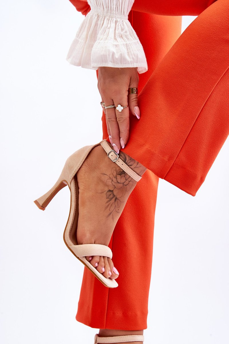 Piękne sandały damskie wykonane z miłego w dotyku eko zamszu. Paseczek z przodu oraz zapiętek są usztywniane. Model z regulowanym paskiem zapinanym na sprzączkę. Miękka, eko skórzana wkładka zapewni komfort podczas użytkowania obuwia. Sandałki zostały osadzone na obcasie w postaci szpilki. Świetny model do sukienek czy eleganckich spodni. Przy wyborze rozmiaru prosimy sugerować się tabelą rozmiarów.