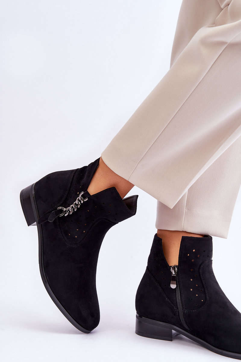Botki zostały wykonane z eko zamszu. Posiadają ażurowe zdobienie na cholewce oraz ozdobny łańcuszek. Wewnątrz obuwia wkładka została wykonana z eko skóry. Zakładanie ułatwi wszyty z boku suwak. Płaski obcas zapewni stabilność na każdym kroku. Model ten dodatkowo posiada usztywniany zapiętek. Nosek w kształcie delikatnego migdała optycznie wysmukli stopę. Przy wyborze rozmiaru prosimy sugerować się tabelą rozmiarów.