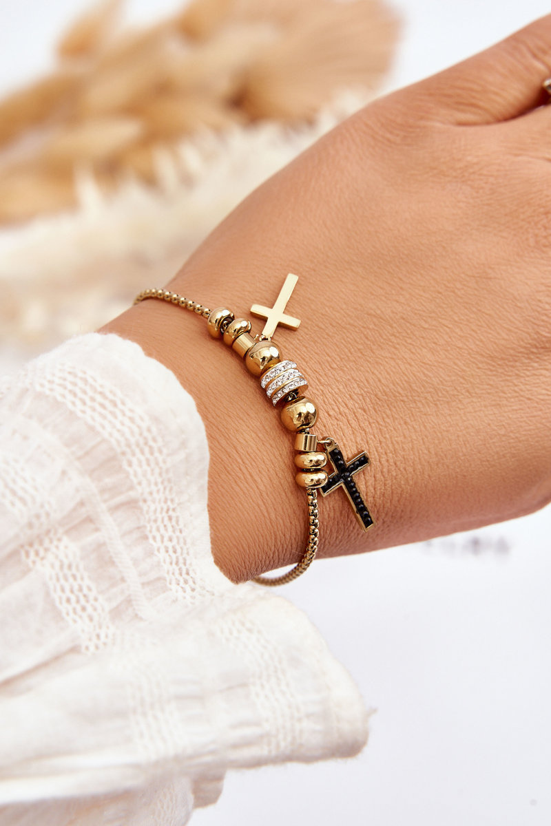Wyjątkowa i elegancka bransoletka damska wykonana ze stali nierdzewnej. Posiada możliwość regulacji długości. Bransoletka o delikatnym splocie z masywniejszymi ozdobami w postaci krzyżyków oraz cyrkonii. Prezentuje się niezwykle elegancko. Założysz ją jako dodatek do wielu stylizacji. Koniecznie sprawdź także pozostałą naszą ofertę dostępnych modeli biżuterii. Świetny model, musisz go mieć!