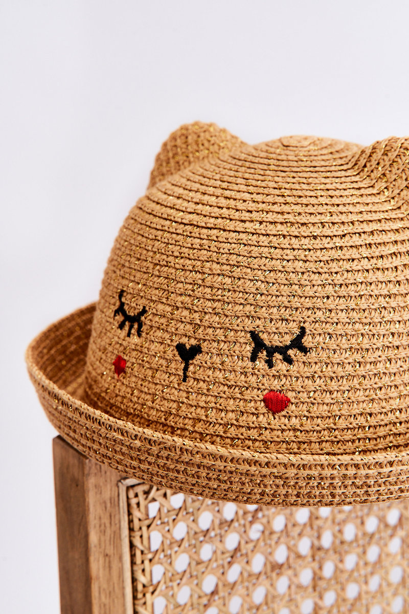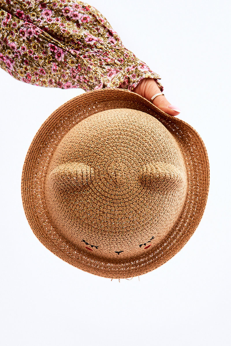 Cudowny kapelusz dziecięcy posiada uroczą buźkę oraz wypukłe uszka. Produkt wykonany jest w 94% z papieru oraz 4% z włókna metalizowanego. Rondo kapelusza jest lekko podwinięte. W środku znajduje się sznureczek pozwalający na regulację i odpowiednie dopasowanie kapelusza.