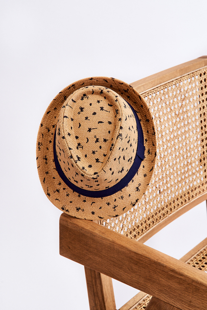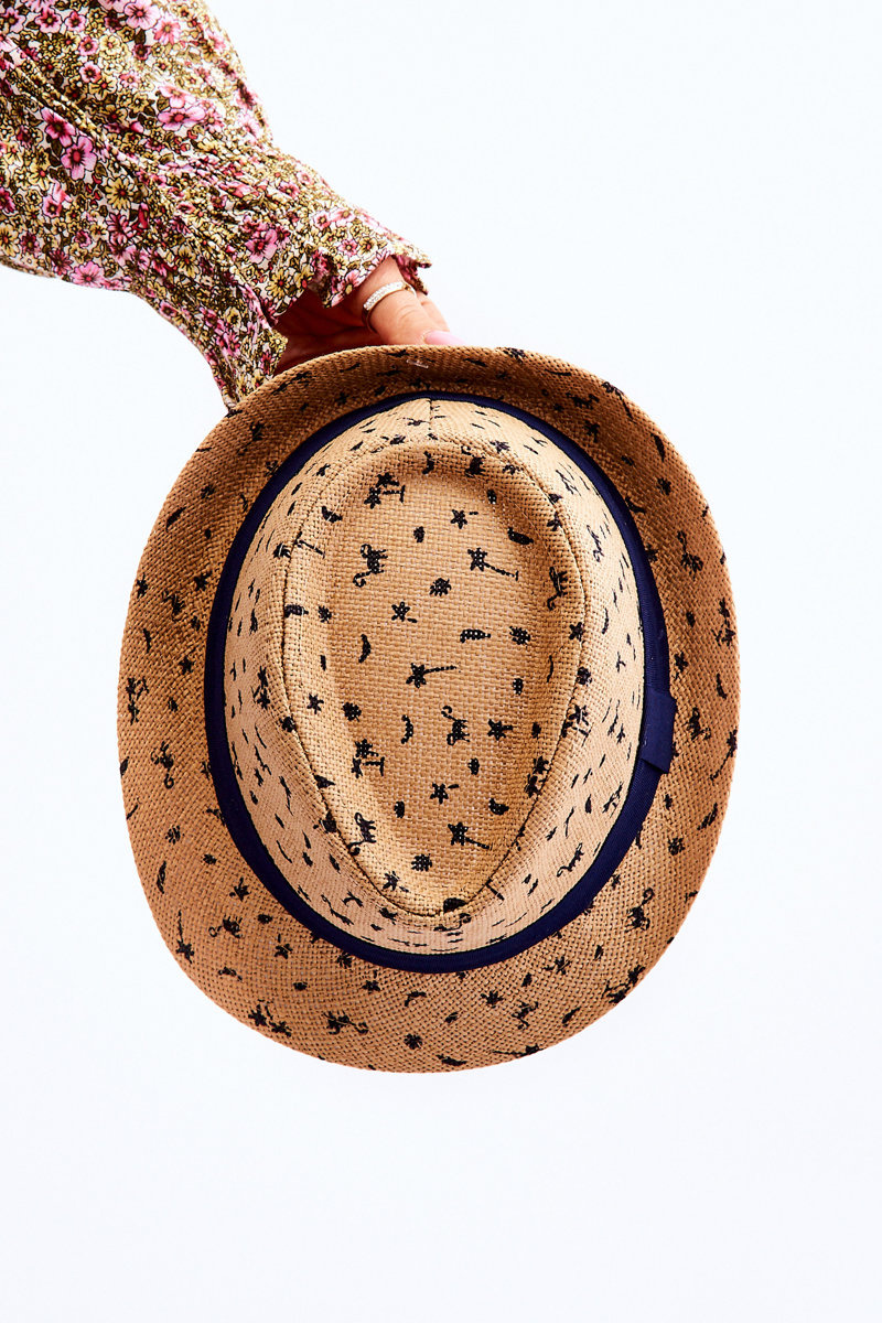 Modny kapelusz dziecięcy posiada nadruk w postaci zwierzątek oraz palm. Produkt wykonany jest w 100% z papieru. Rondo kapelusza z jednej strony jest lekko podwinięte, natomiast z drugiej proste. Kapelusz nie posiada regulacji obwodu. Przy rondzie dodatkowo znajduje się ozdobna wstążka.