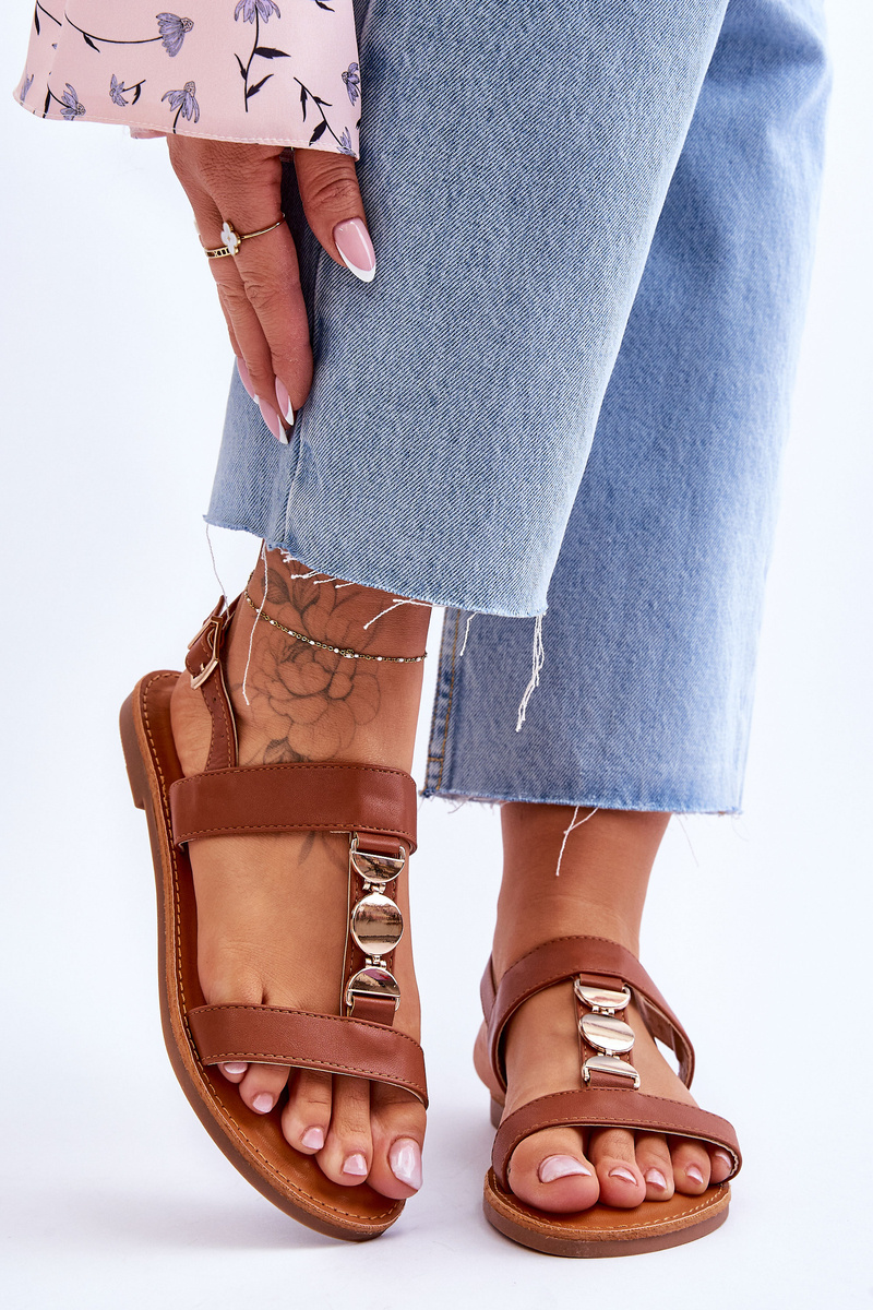 Damskie Płaskie Sandały Z Ozdobnym Paskiem Brązowe Berry