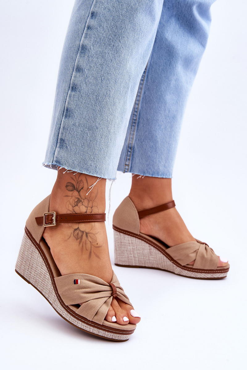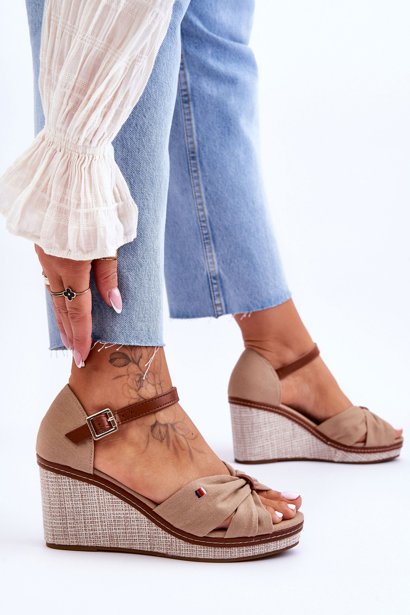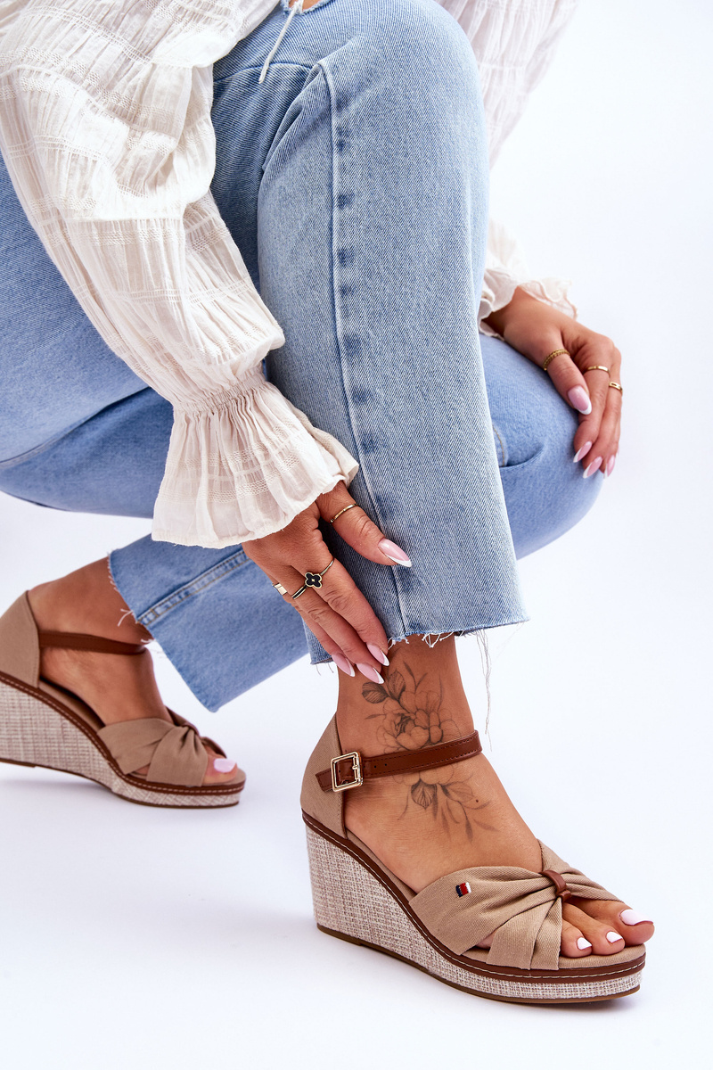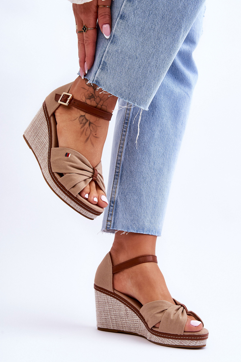 Sandały Damskie Na Plecionym Koturnie Ciemnobeżowe Judith