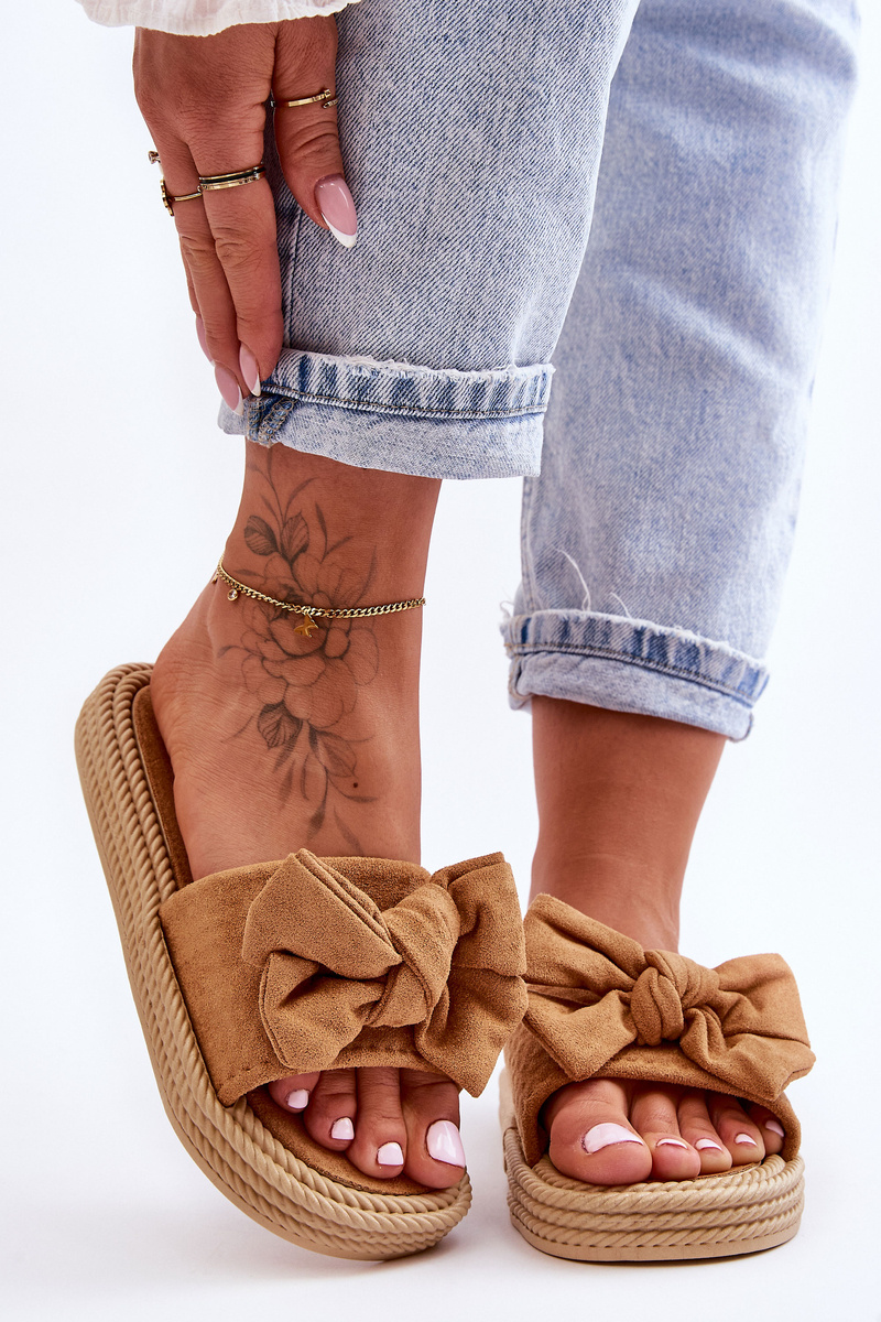 Damskie Zamszowe Klapki Z Kokardą Camel Fency