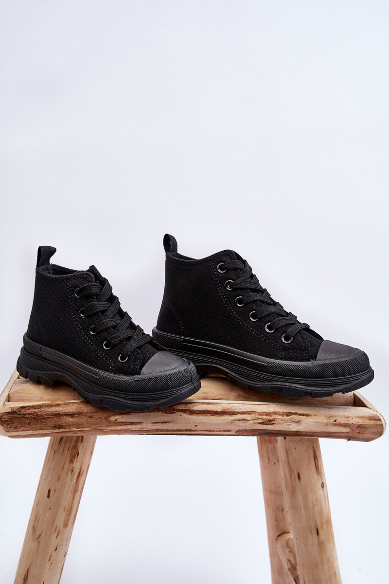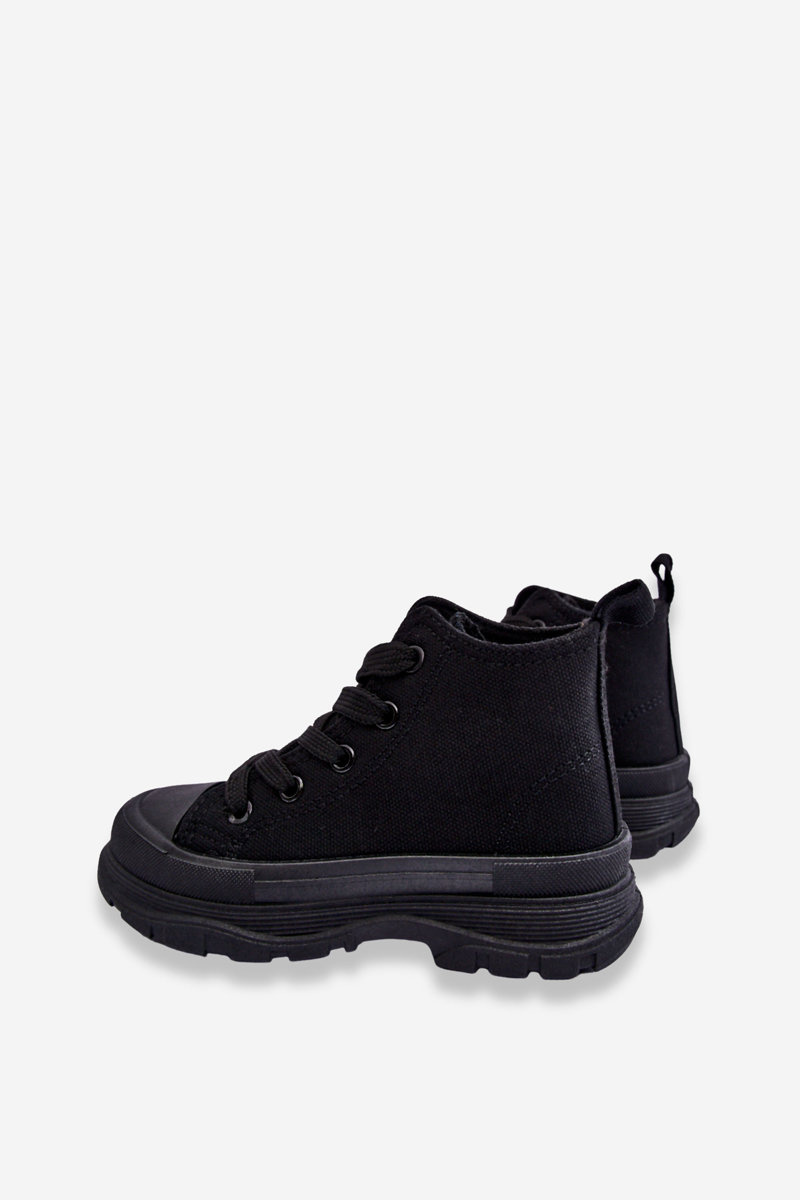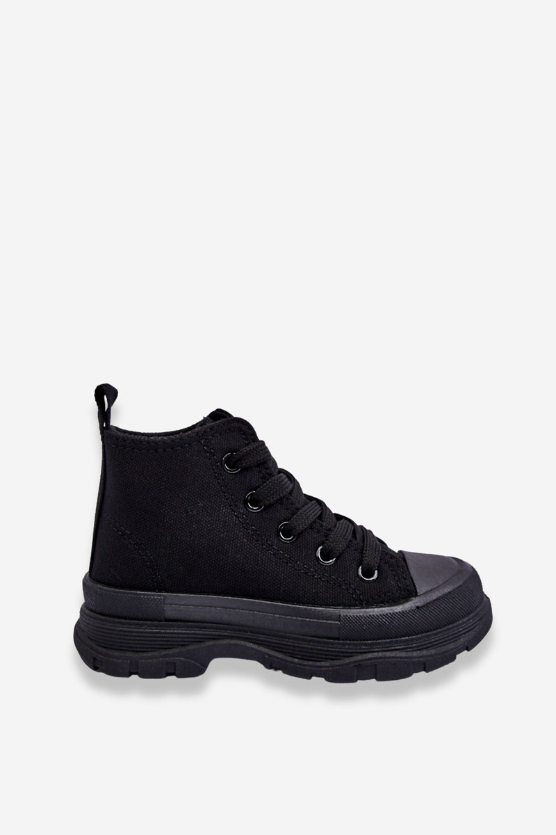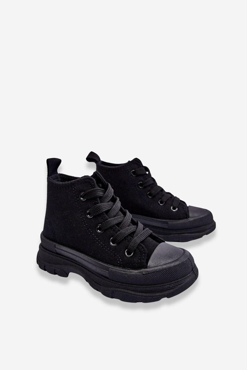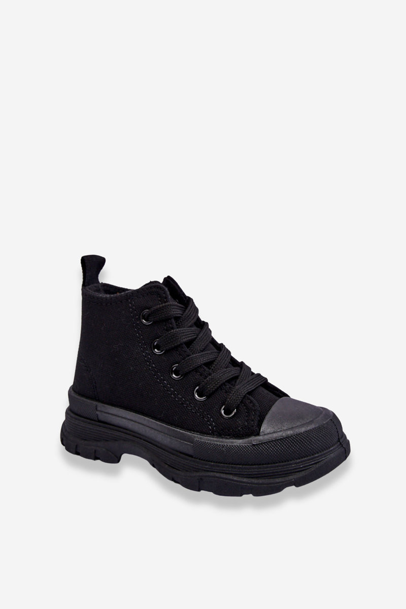 Wysokie trampki wykonane z materiału tekstylnego posiadają z przodu wzmocnienie w postaci gumowego tworzywa. Buty posiadają miękką materiałową wkładkę, która jest dodatkowo wyciągana. Antypoślizgowa podeszwa wykonana z gumowego tworzywa świetnie sprawdzi się podczas zabaw na świeżym powietrzu. Model klasycznie wiązany. Twoje dziecko na pewno będzie zadowolone z tych butów! Wygoda i komfort gwarantowane. Przy wyborze rozmiaru prosimy sugerować się tabelą rozmiarów.
