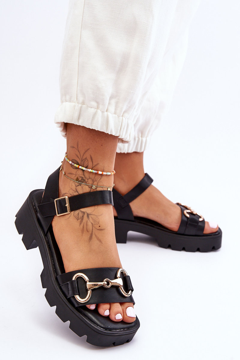 Wygodne sandały damskie zostały osadzone na płaskim obcasie oraz platformie. Wykonane z eko skóry z szerokim paskiem przytrzymującym stopę przed przesuwaniem się z ozdobą. Miękka wkładka pozwoli na komfortowe użytkowanie obuwia nawet przez cały dzień! Model ten jest zapinany wokół kostki na regulowany pasek ze sprzączką. Podeszwa wykonana z tworzywa sztucznego. Idealny model na letnie, upalne dni. Przy wyborze rozmiaru prosimy sugerować się tabelą rozmiarów.