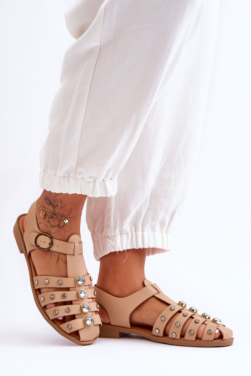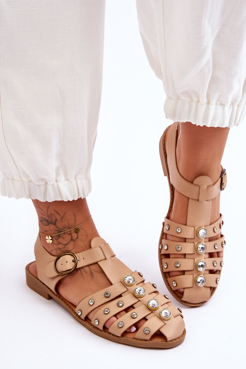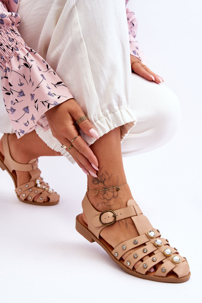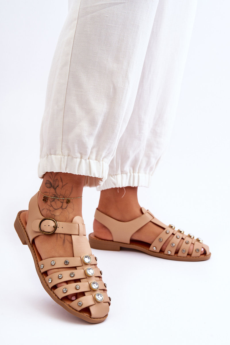 Damskie Płaskie Sandały Z Cyrkoniami Beżowe Ascot