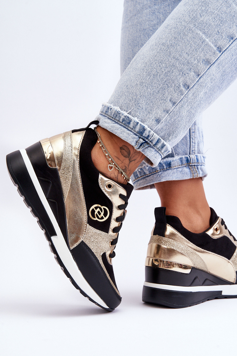 Damskie Sznurowane Buty Sportowe Na Koturnie Czarno-Złote Genova