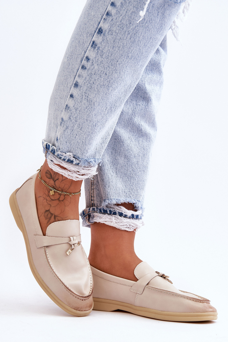 Klasyczne, wsuwane mokasyny damskie z pewnością sprawdzą się w wielu stylizacjach! To model, który powinien znaleźć się w Twojej szafie! Mokasyny posiadają z przodu pasek z małą ozdobą. Buty te zostały wykonane z eko skóry. Osadzono je na płaskim obcasie, dzięki któremu są wygodne w użytkowaniu. Przy wyborze rozmiaru prosimy sugerować się tabelą rozmiarów.