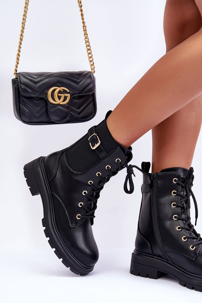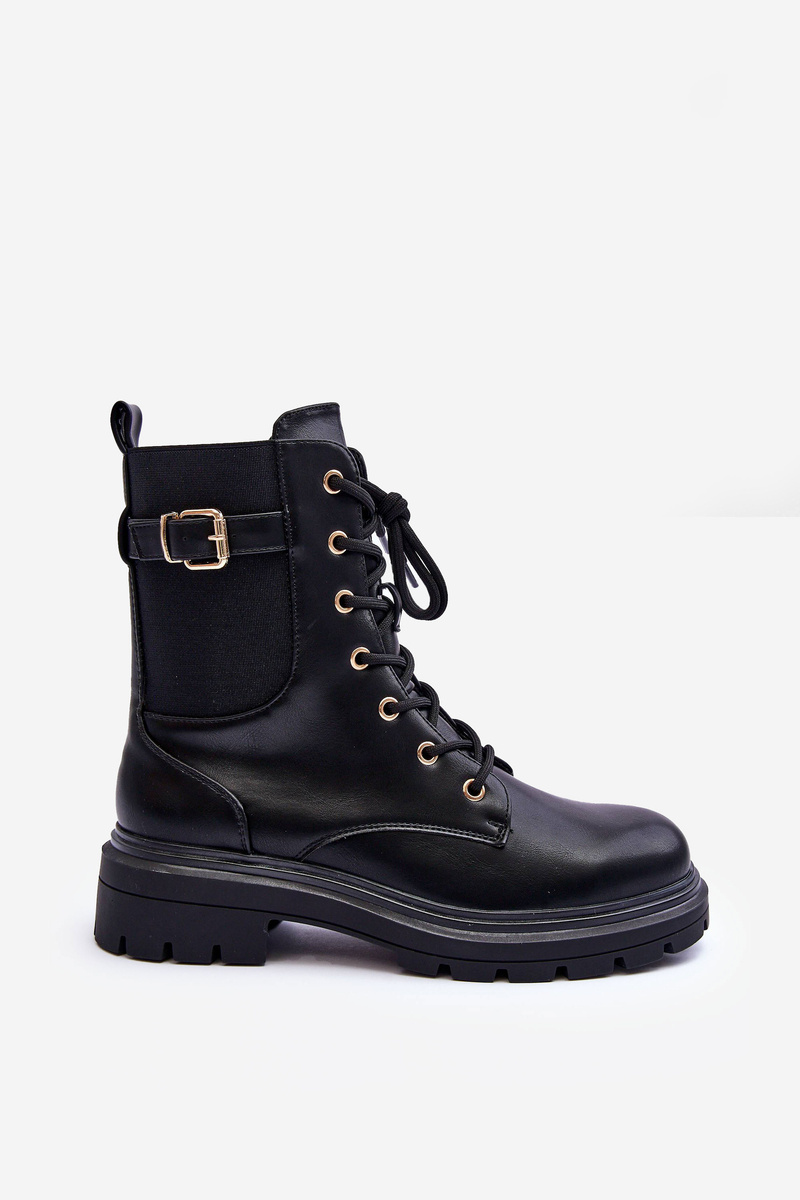 Modne botki wykonane z eko skóry. Osadzone na płaskim obcasie i platformie. Zapinane są z boku cholewki na zamek oraz dodatkowo sznurowane. Model ten posiada ozdobę w postaci paska ze sprzączką. Zapiętek w tym obuwiu jest usztywniany. Świetny model do jesiennych i zimowych stylizacji! Przy wyborze rozmiaru prosimy sugerować się tabelą rozmiarów.