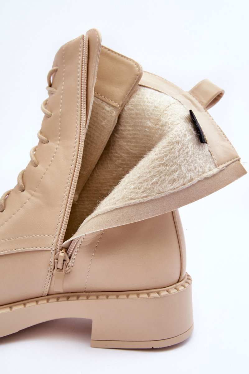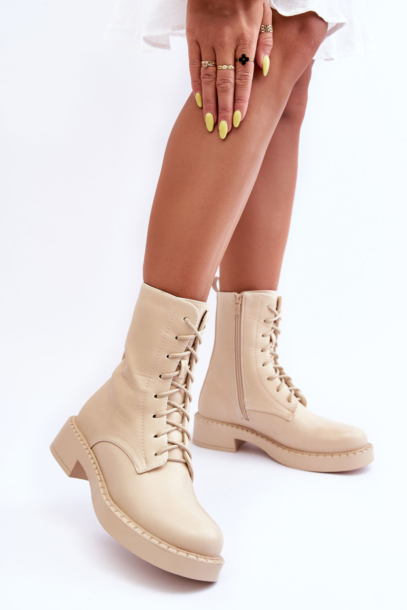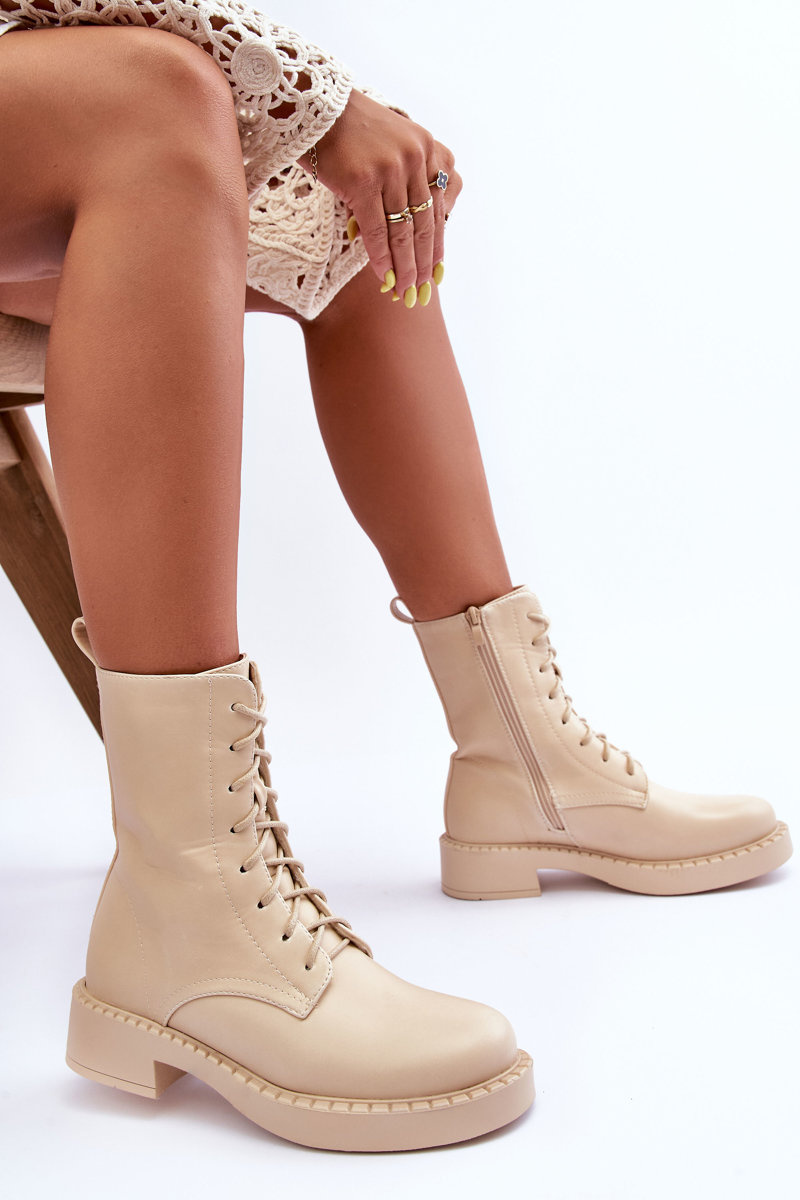 Skórzane Botki Workery Na Płaskim Obcasie Jasnobeżowe Aganne