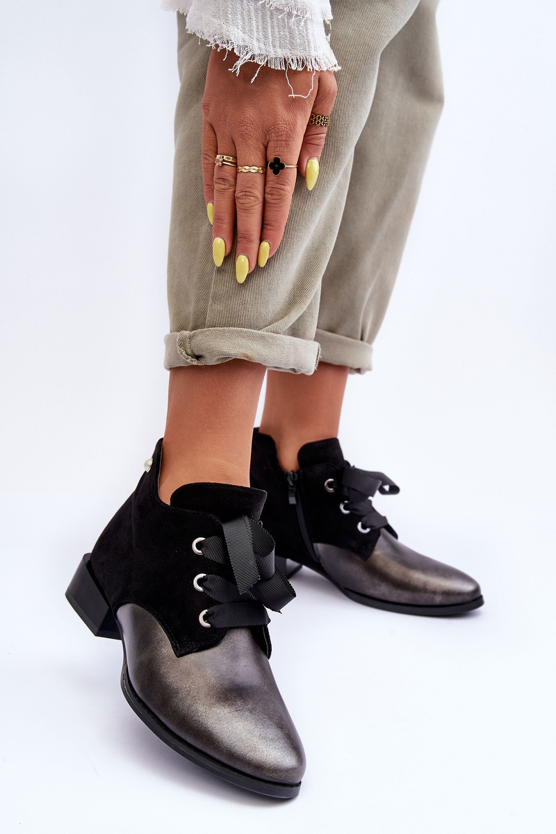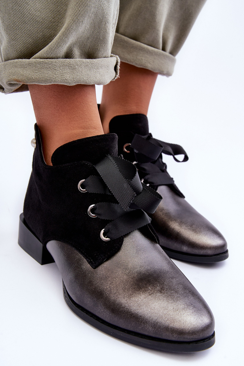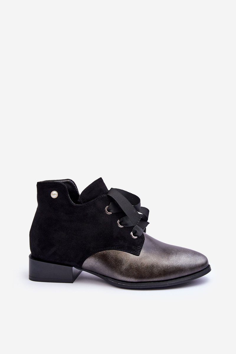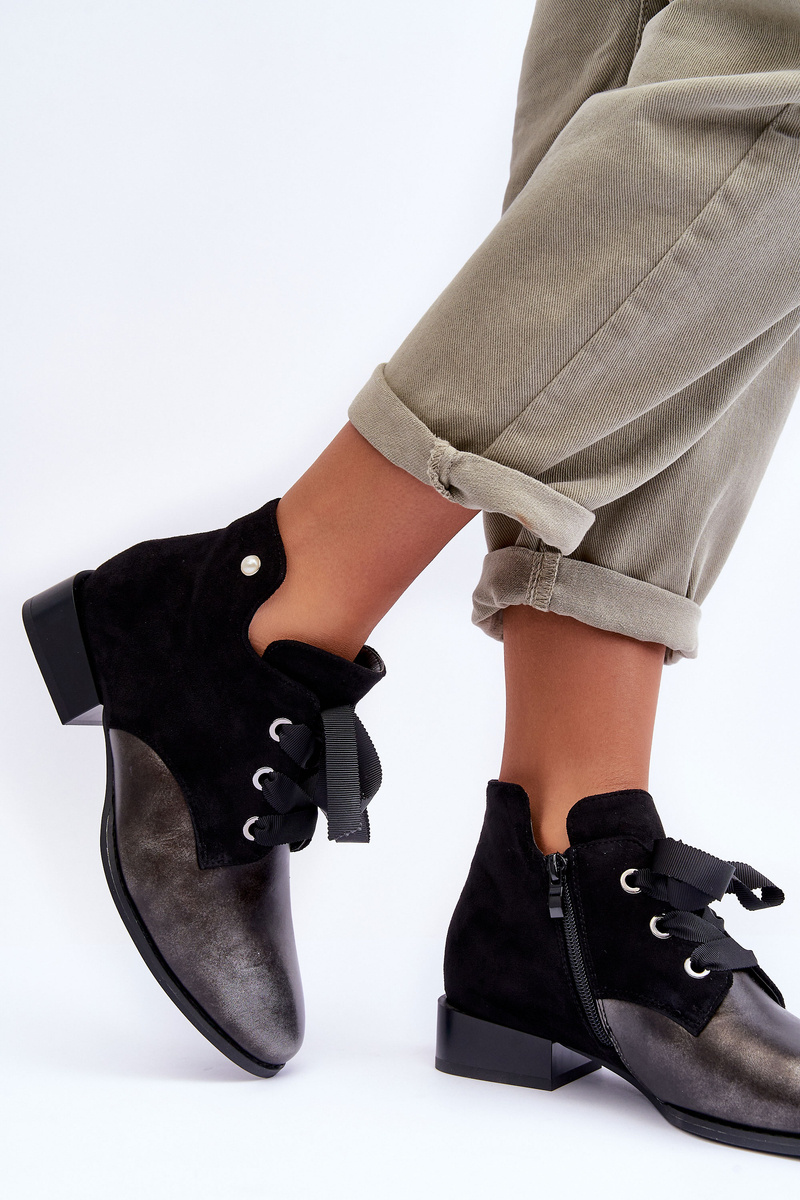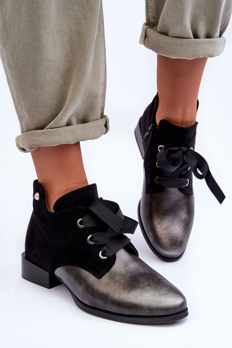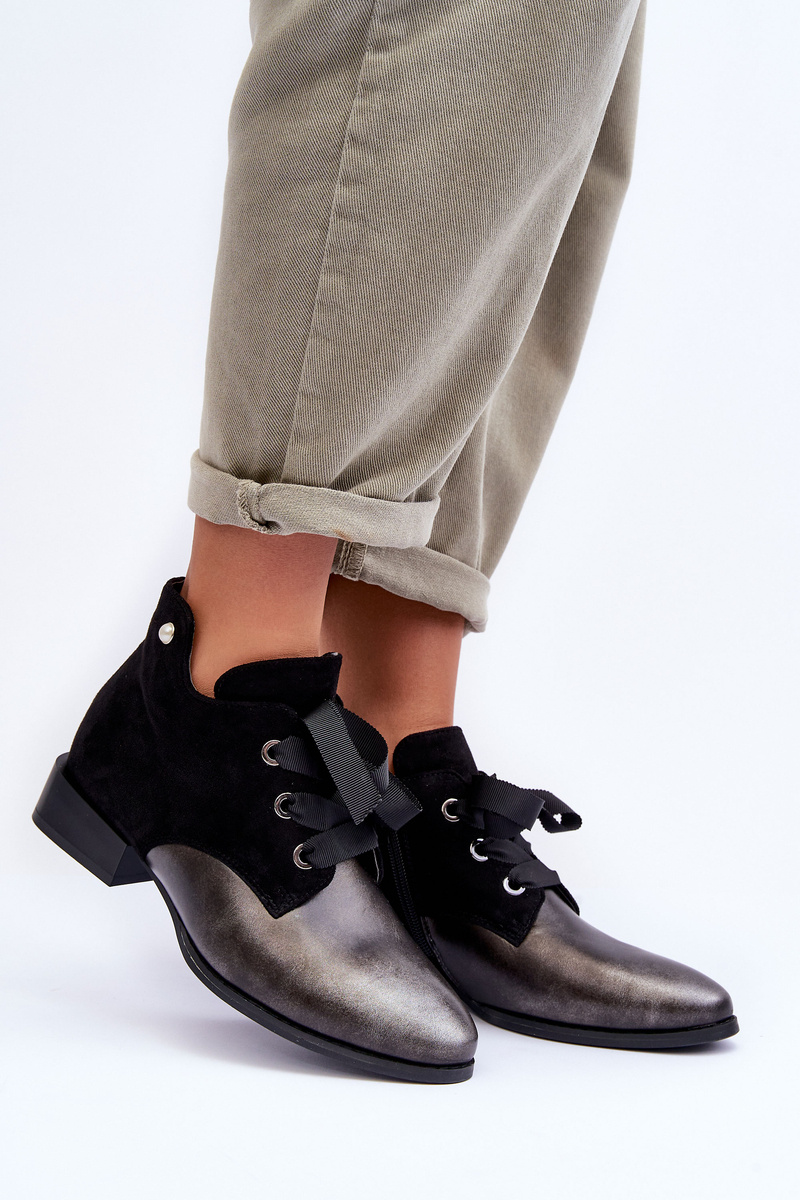 Damskie Półbuty Na Płaskim Obcasie Z Wiązaniem Czarne Meroni - Zamsz