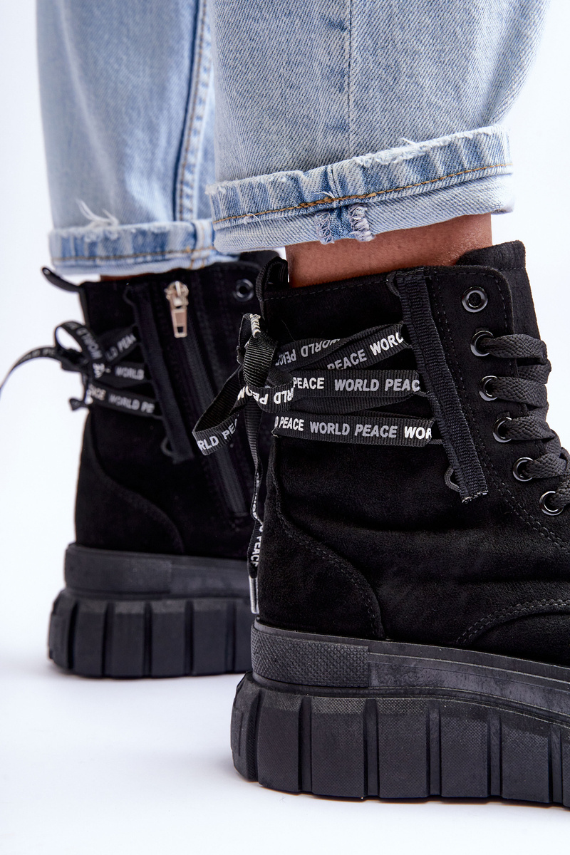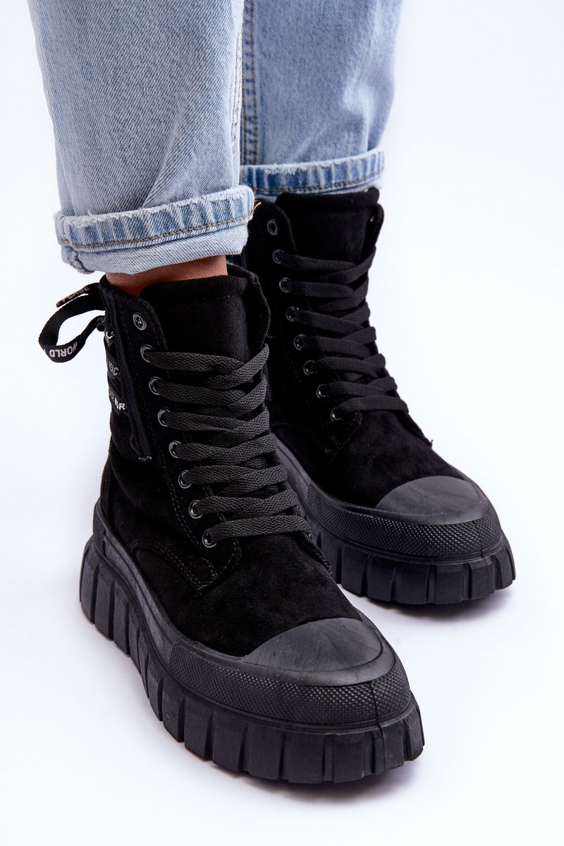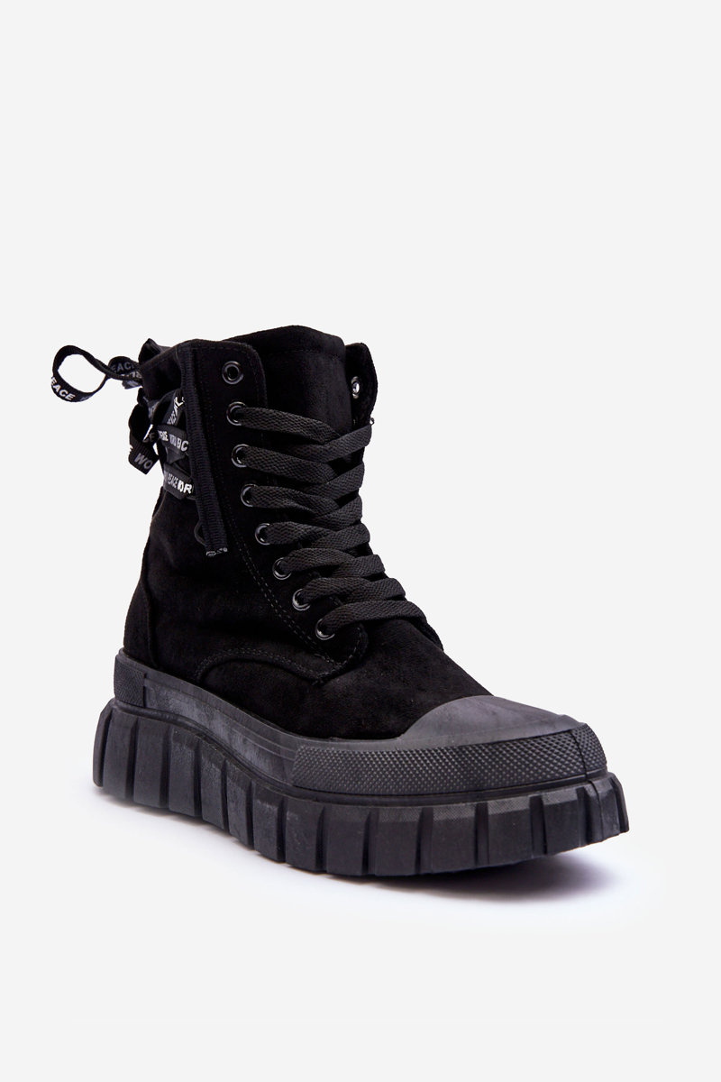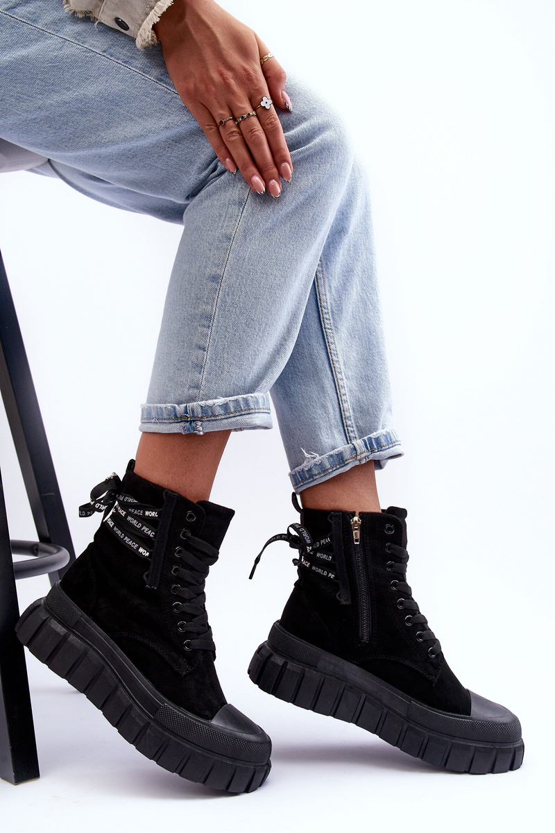 Modne botki damskie zostały osadzone na masywnej platformie z gumowego tworzywa. Wykonane z eko zamszu. Model ten zapinany jest na suwak z boku cholewki oraz dodatkowo sznurowany. Nosek jest zaokrąglony. Materiałowa wkładka zapewni komfort oraz wygodę. Koniecznie powinnaś je mieć w swojej garderobie. Przy wyborze rozmiaru prosimy sugerować się tabelą rozmiarów.