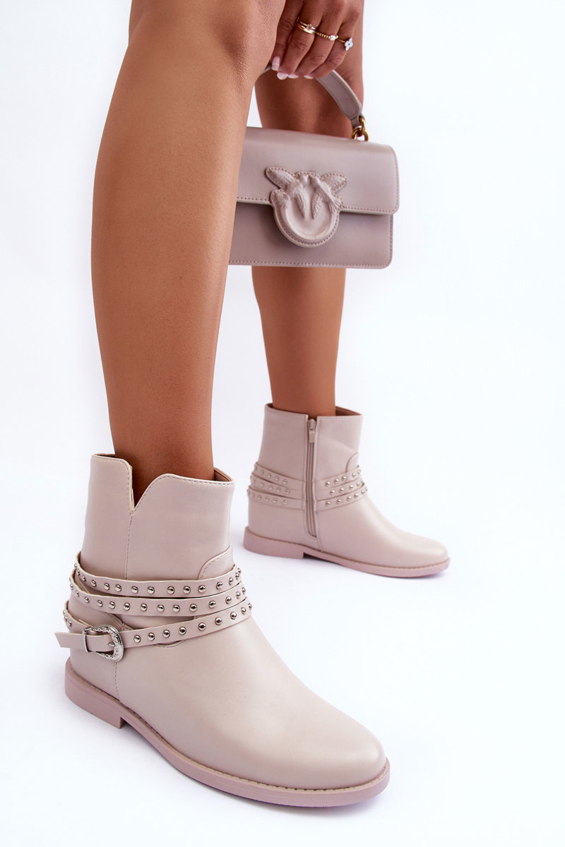 Zdobione Skórzane Botki Damskie Na Płaskim Obcasie Beżowe Adkrana