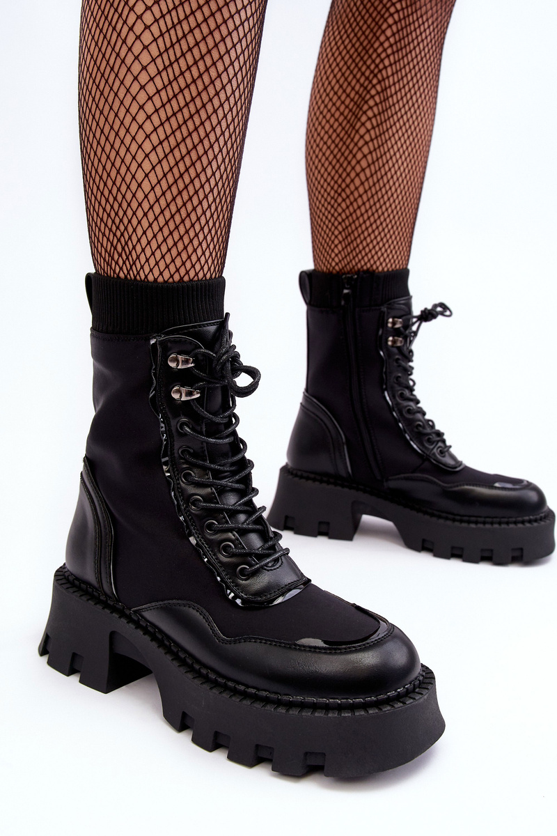 Workery damskie osadzone na masywnym, płaskim obcasie oraz platformie. Wykonane z połączenia eko skóry i materiału tekstylnego. Z przodu sznurowane oraz dodatkowo zapinane na suwak po wewnętrznej stronie cholewki. Noski zaokrąglone. Środek ocieplony kocem obuwniczym. Sprawdź całą naszą kolekcję wysokich botków! Przy wyborze rozmiaru prosimy sugerować się tabelą rozmiarów.