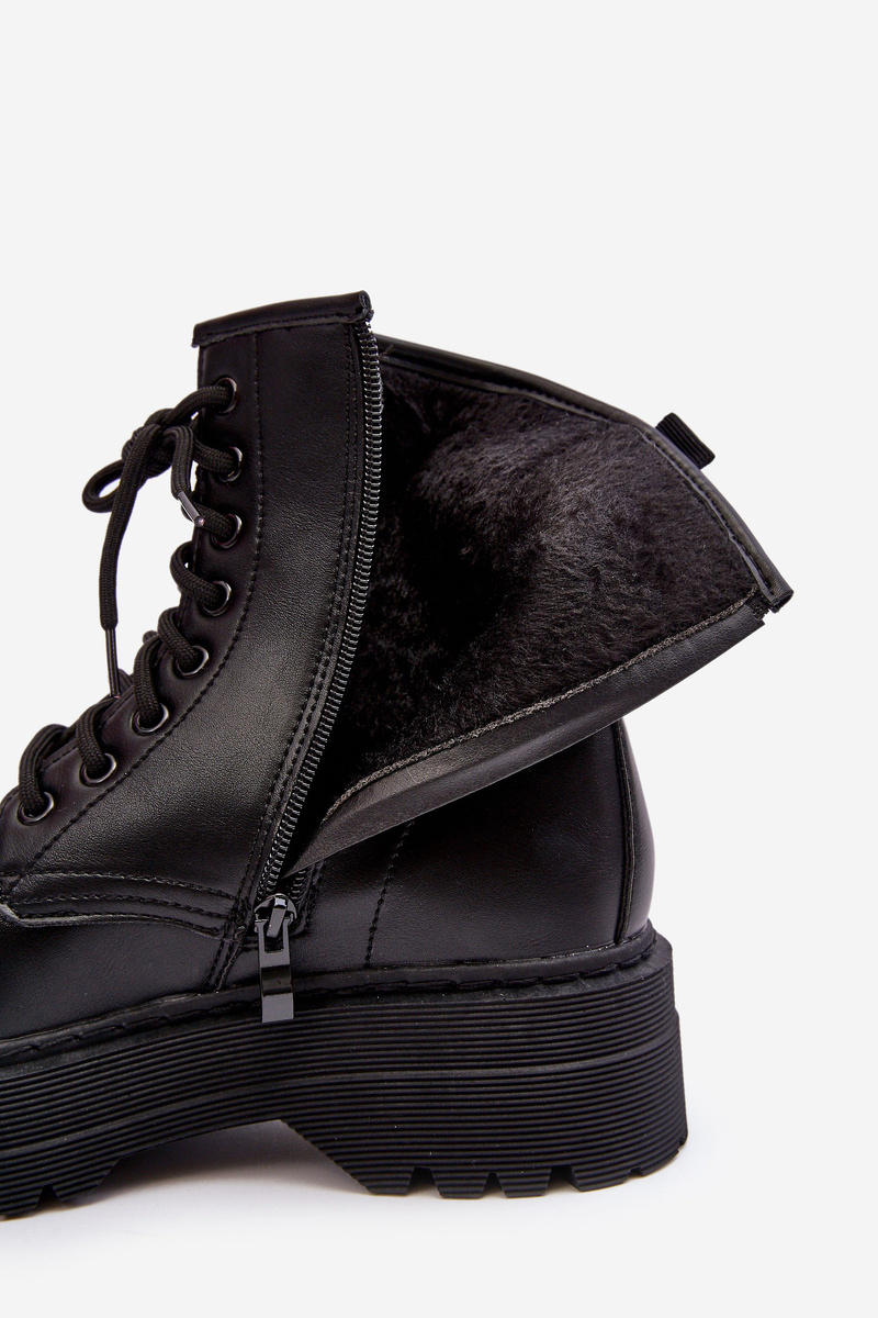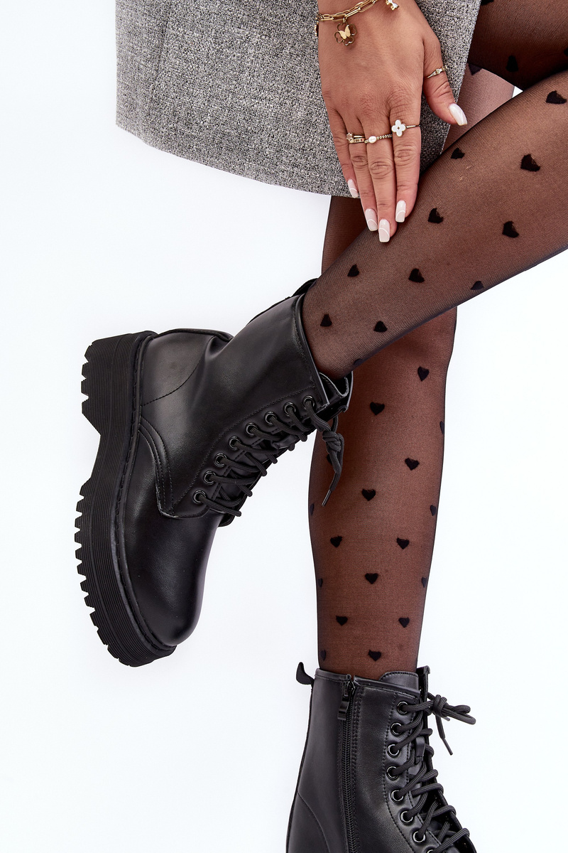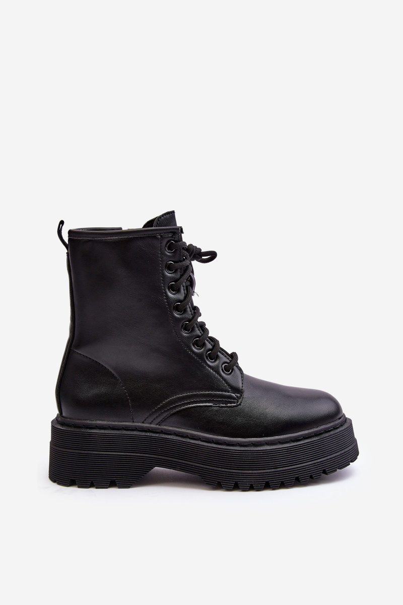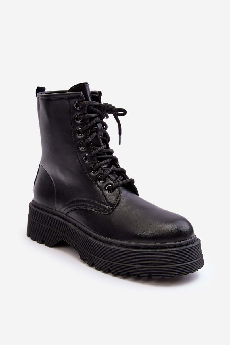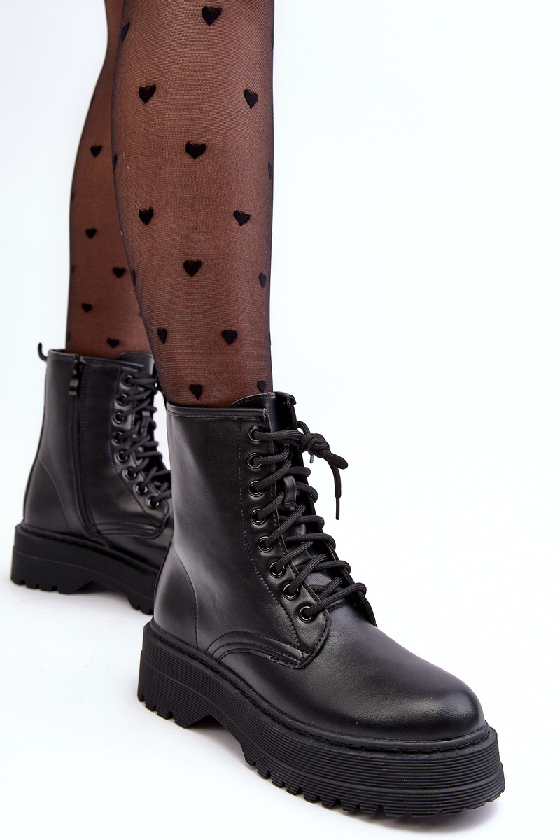 Damskie Sznurowane Botki Workery Na Grubej Podeszwie Czarne Biancis