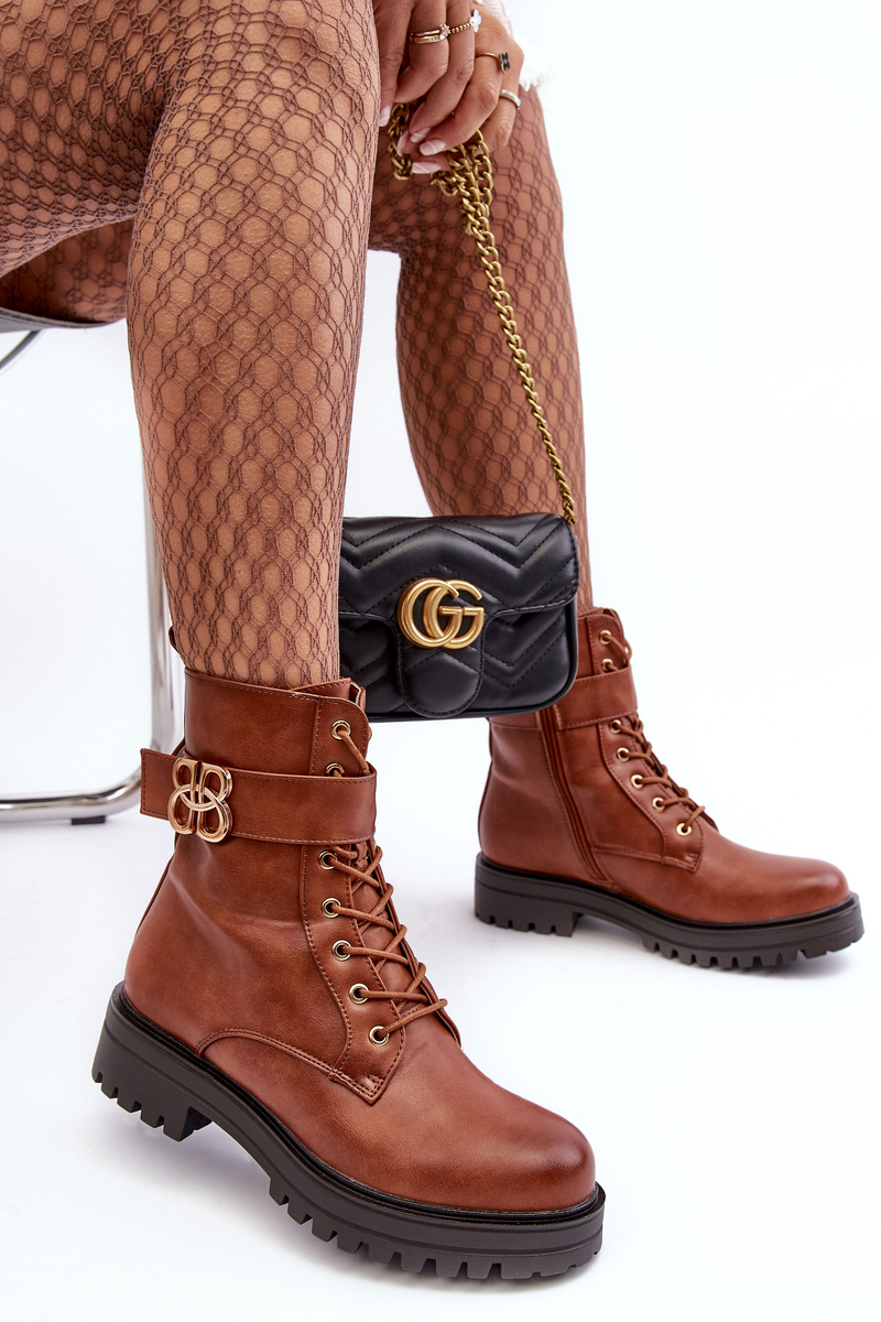 Botki damskie osadzone na płaskim, stabilnym obcasie. Z przodu sznurowane oraz dodatkowo zapinane suwakiem. Noski zaokrąglone. Wewnątrz ocieplone kocem obuwniczym. Na cholewce pasek ze złotą ozdobą. Dodatkowo zapiętek jest usztywniony. Przy wyborze rozmiaru prosimy sugerować się tabelą rozmiarów.