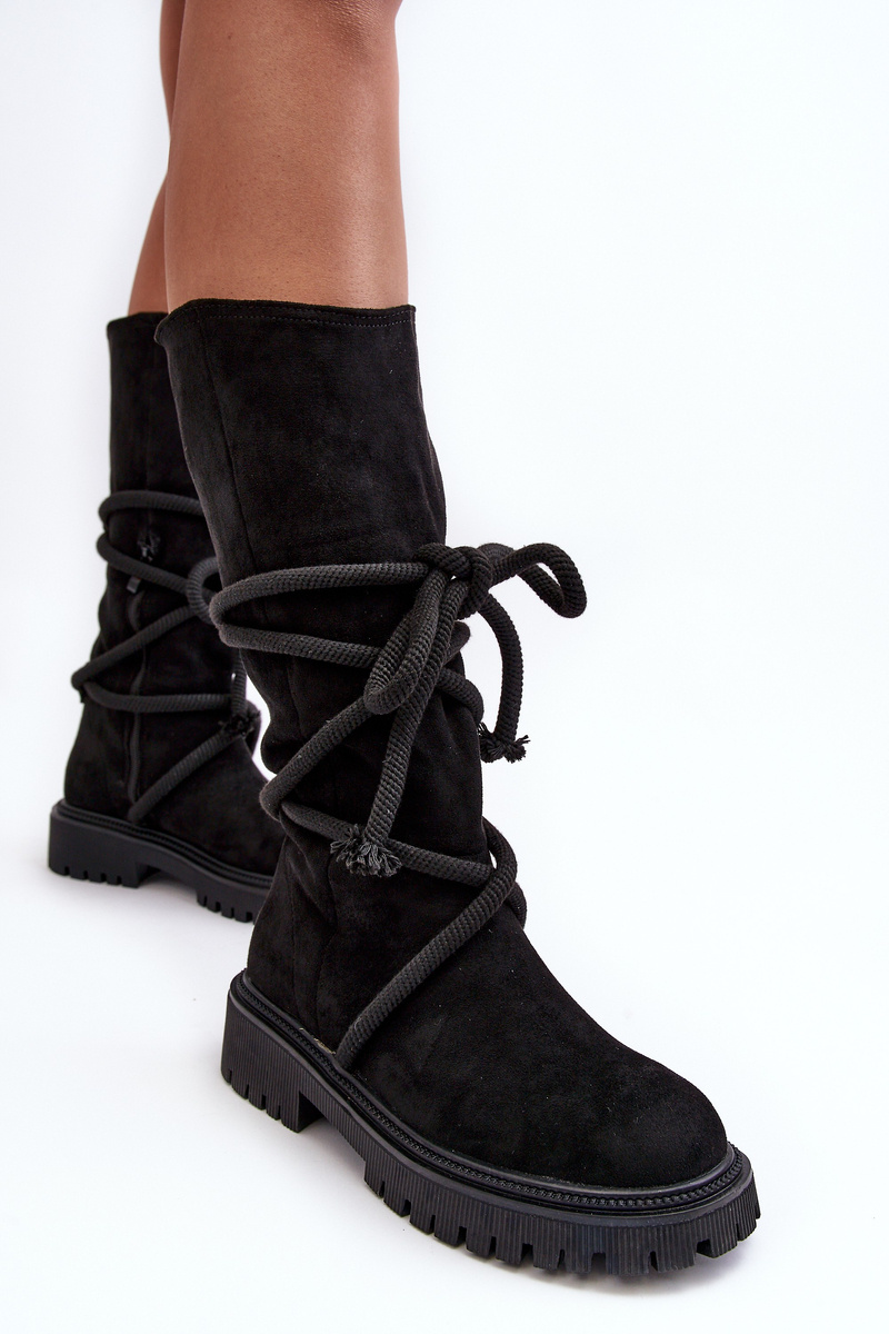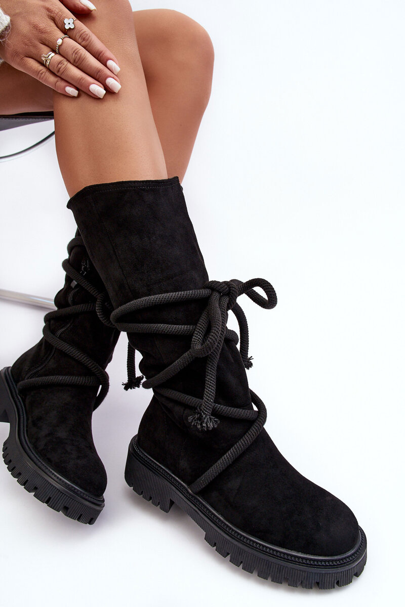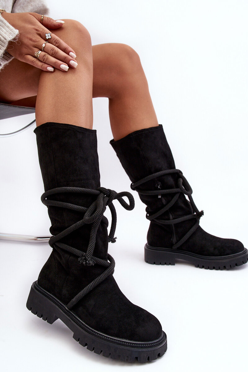 Zamszowe Kozaki Damskie Z Wiązaniem Czarne Tanive