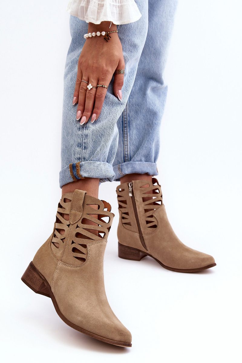 Ażurowe Damskie Skórzane Botki Beżowe Lewski 3329