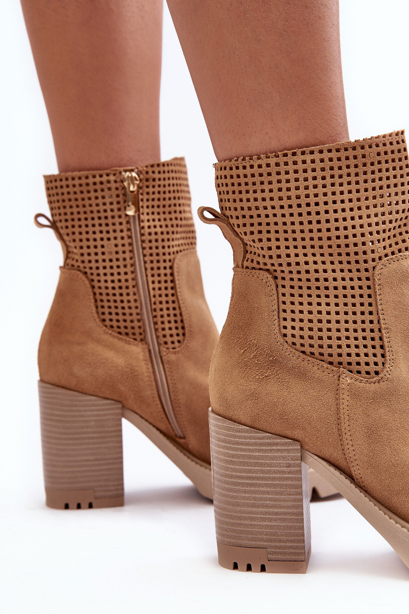 Zamszowe Ażurowe Botki Damskie Na Słupku Camel Lewski 3386