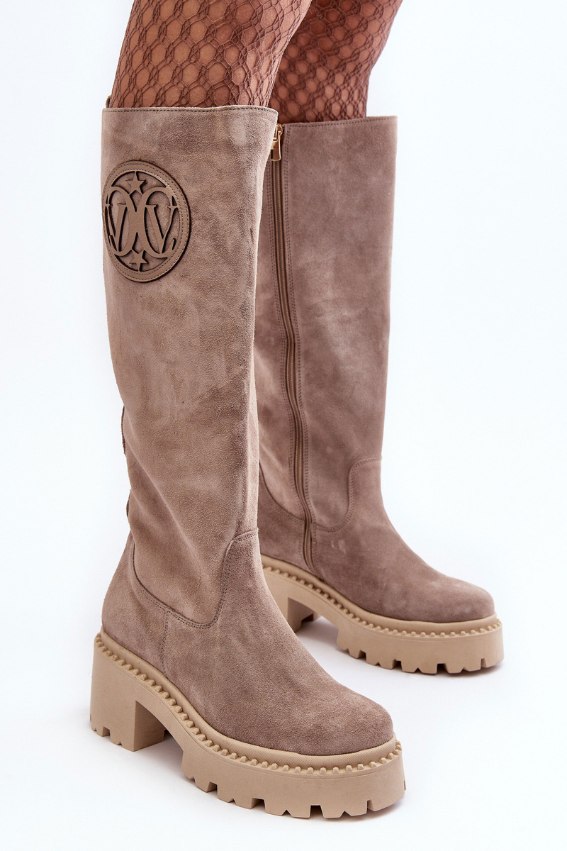 Damskie Zamszowe Kozaki Przed Kolano Ciemnobeżowe Lewski 3367