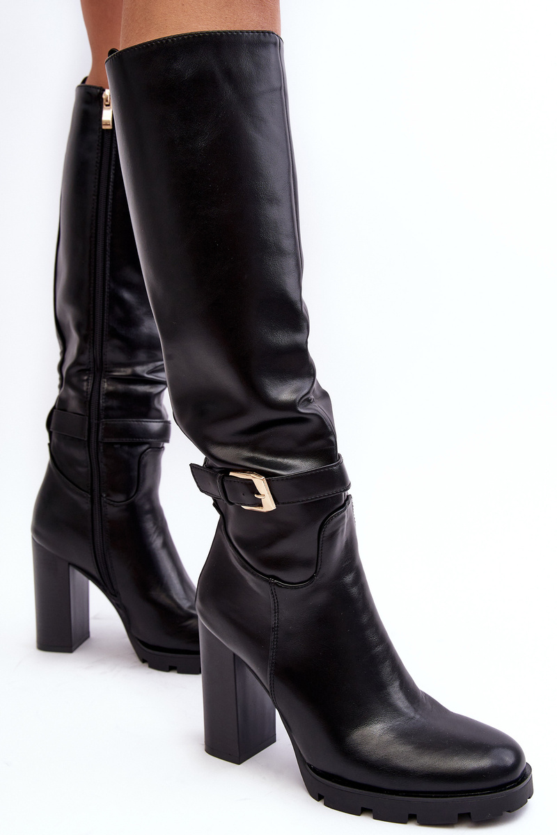 Skórzane Damskie Kozaki Na Słupku Z Klamrą Czarne Bordda