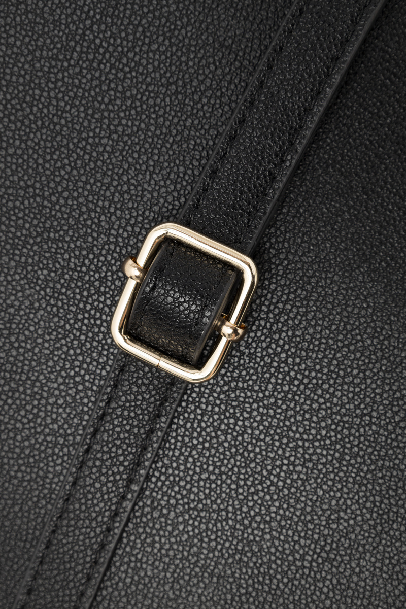 Duża torebka wykonana z połączenia eko skóry i eko zamszu. Z przodu pasek ze złotym elementem. Torebka posiada główną komorę, która zamyka się na suwak, oraz wnętrze z trzema kieszeniami: dwie z nich są otwarte, a trzecia wyposażona jest w zamek błyskawiczny. Dodatkowo do torebki dołączony jest cienki, regulowany, odpinany pasek. Model ten jest bardzo pojemny, mieści format A4. Pasuje do wielu stylizacji.