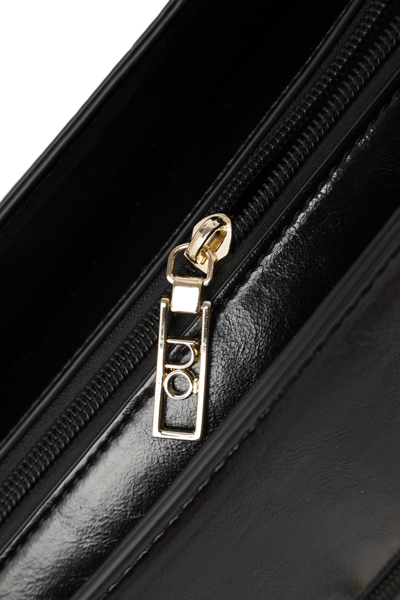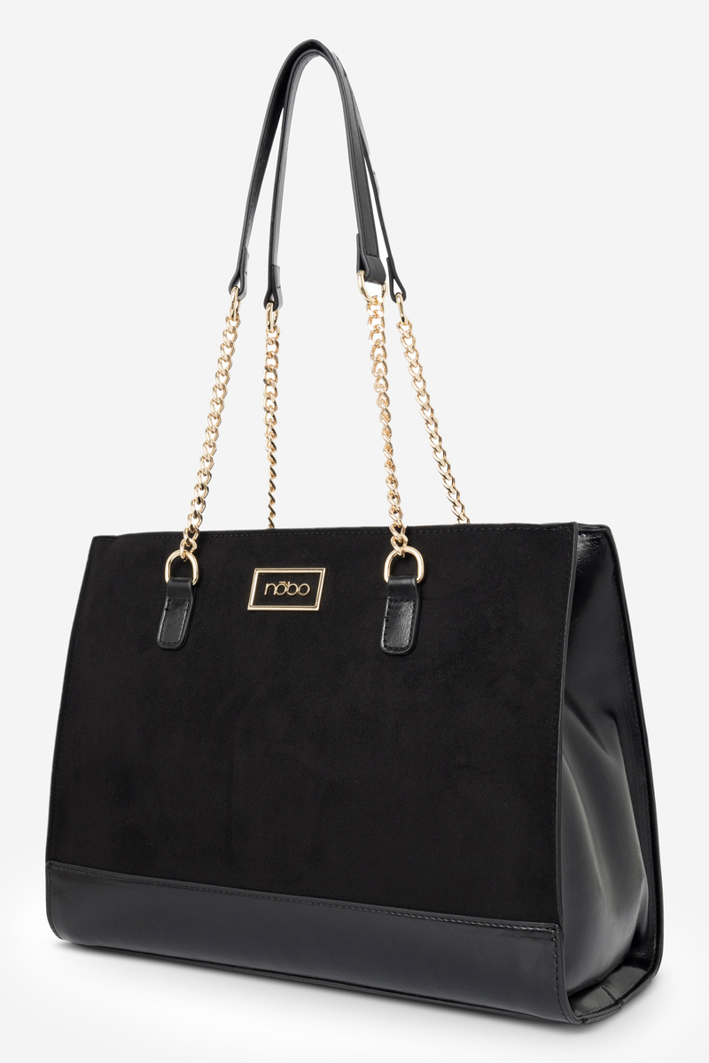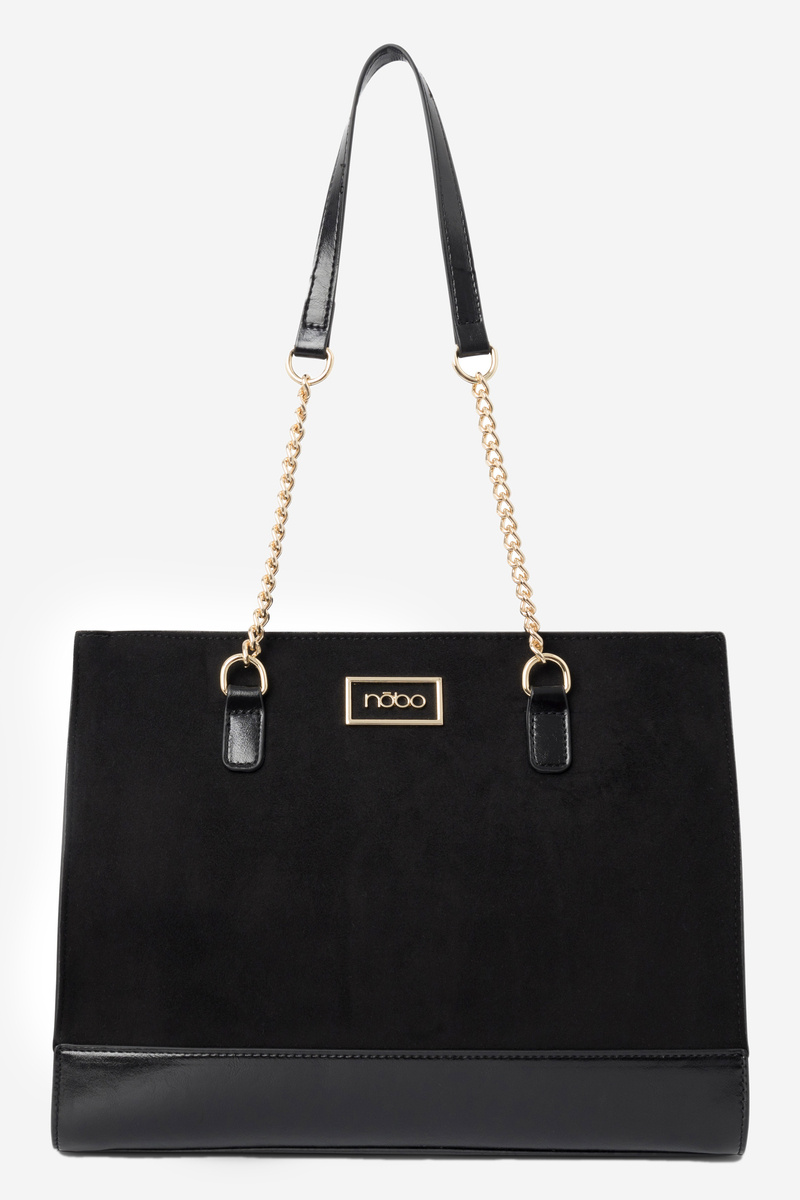 Torebka na ramię marki Nobo. Wykonana z połączenia eko skóry i eko zamszu. Torebka jest dwukomorowa. Małe, złote logo z przodu. Model ten pomieścić dokumenty w formacie A4. Wnętrze z czterema kieszeniami: dwie otwarte, dwie zapinane na suwak.