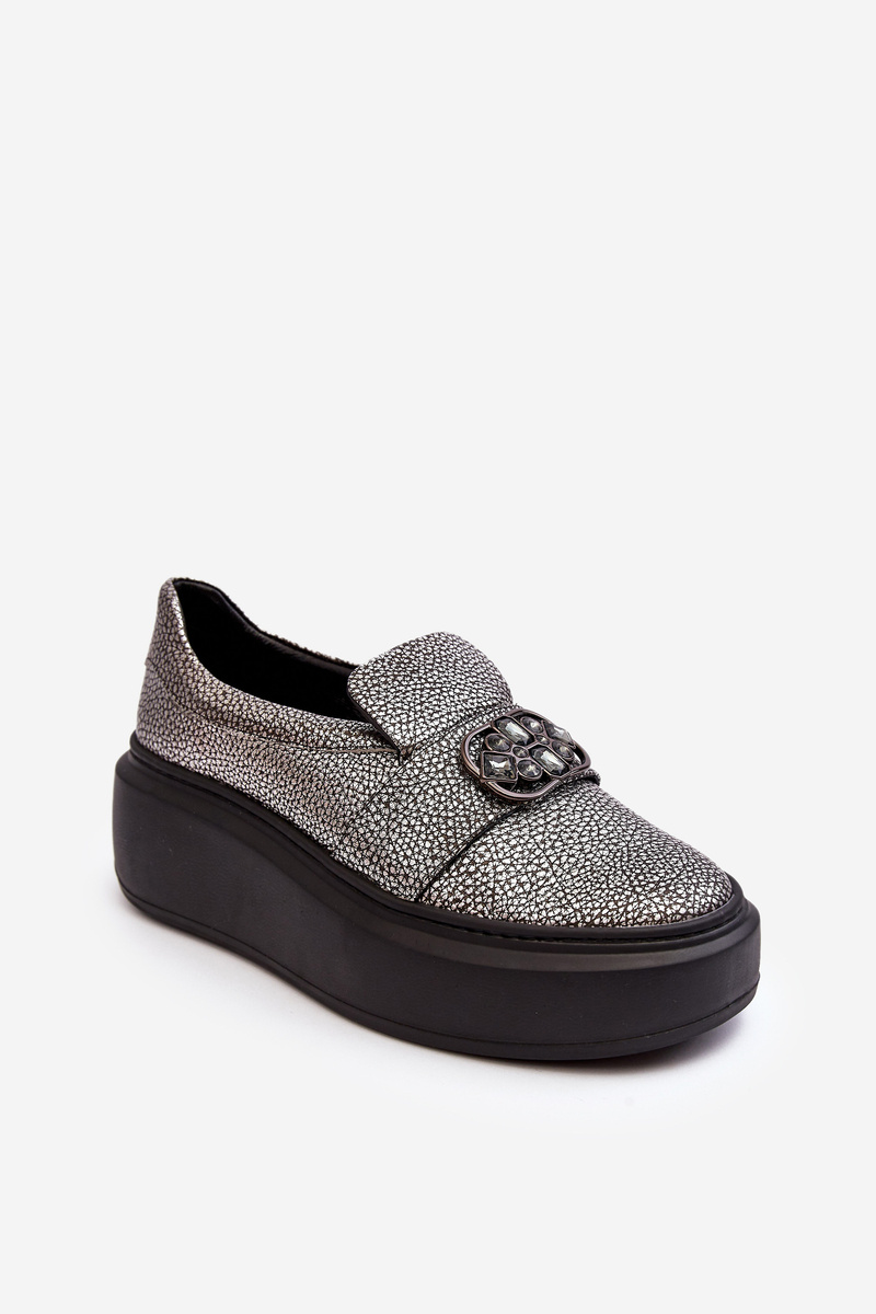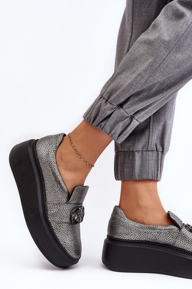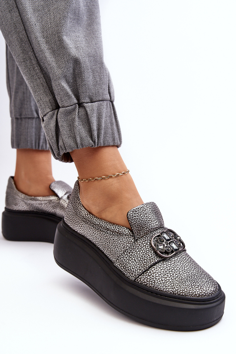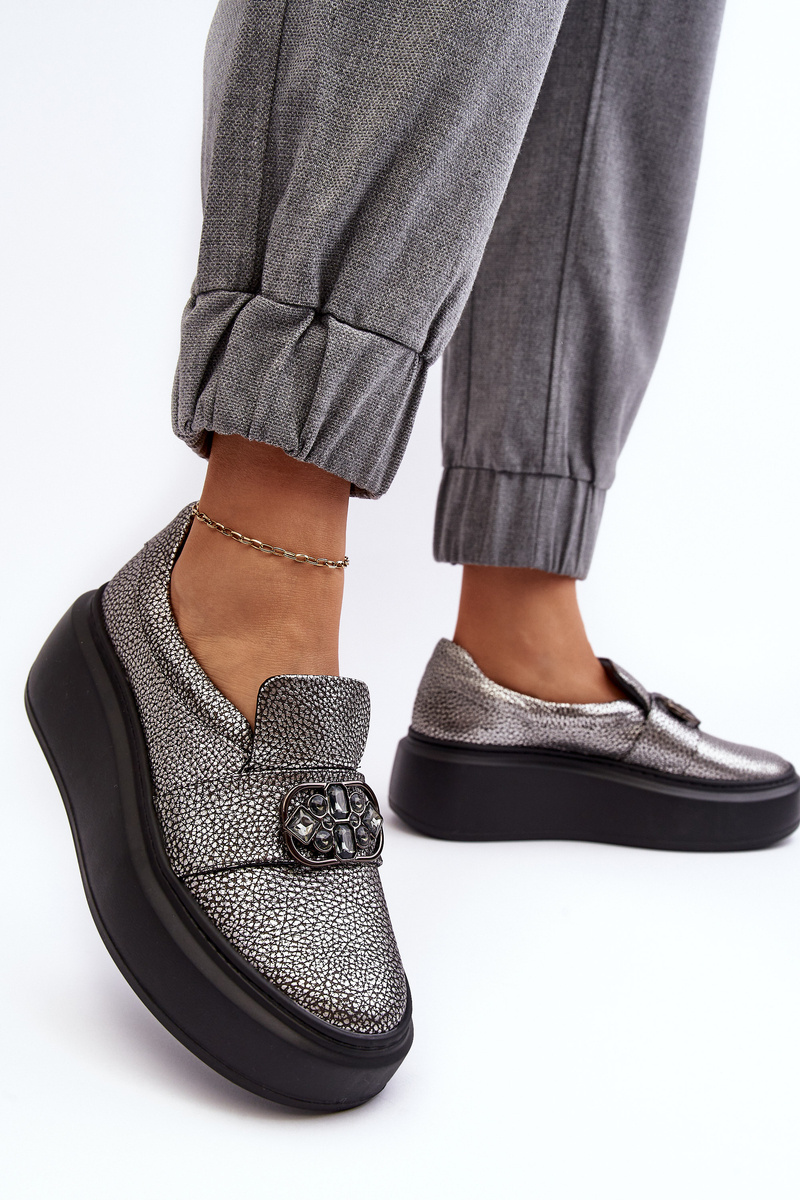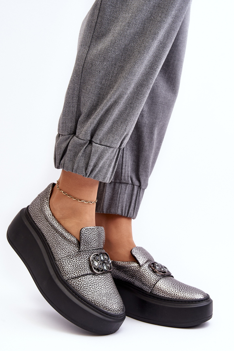 Skórzane Półbuty Damskie Na Platformie Z Ozdobą Laura Messi 2697/810 Srebrne