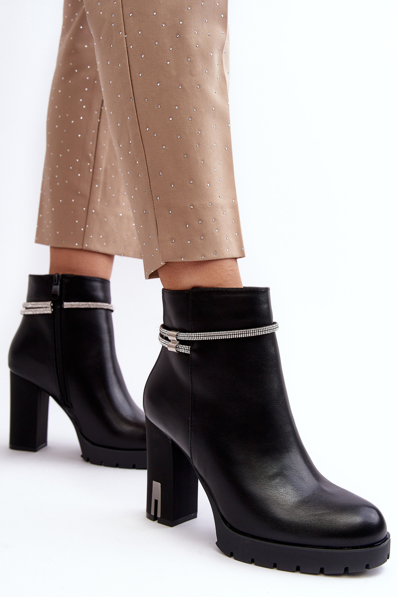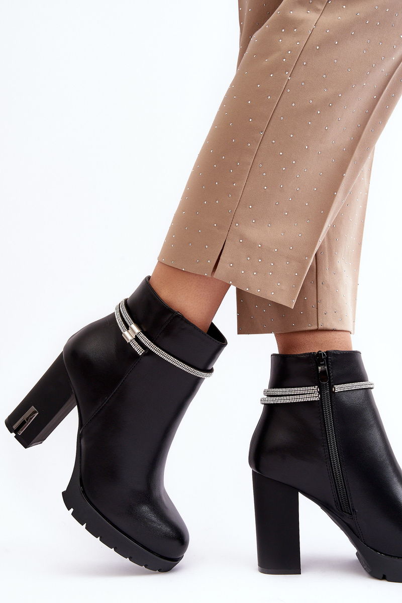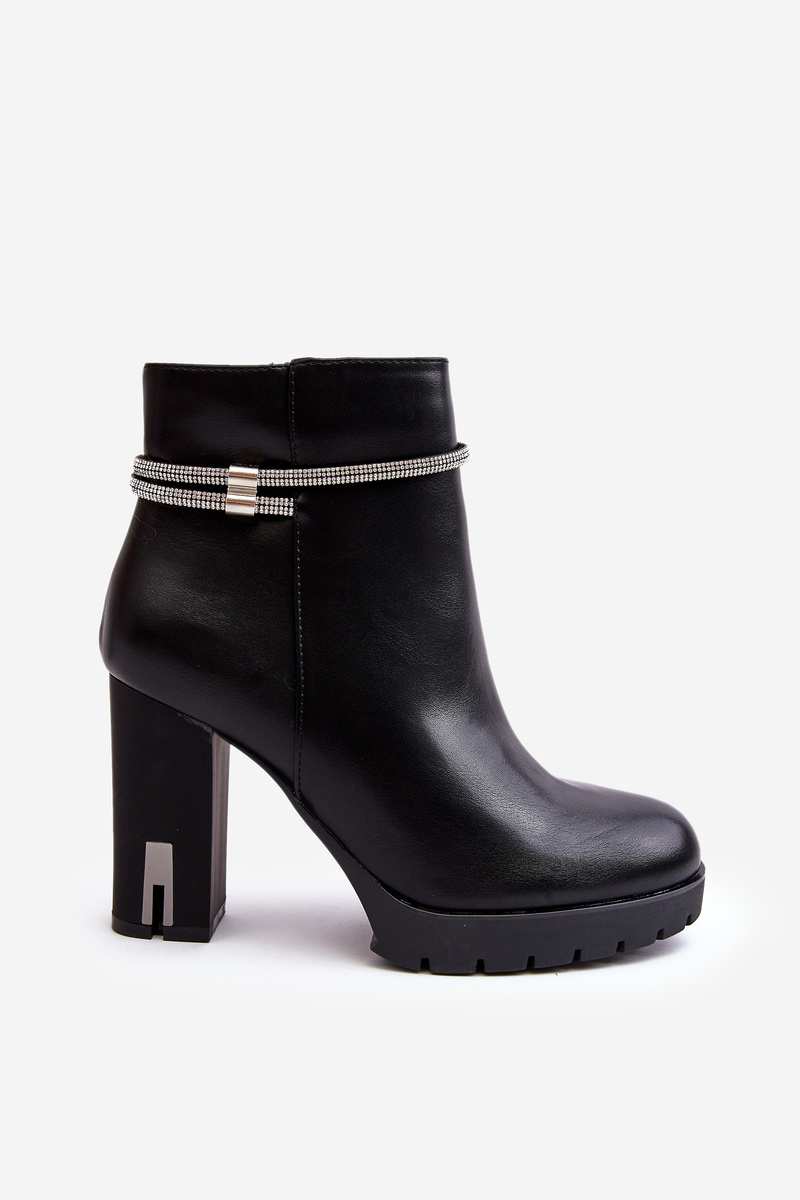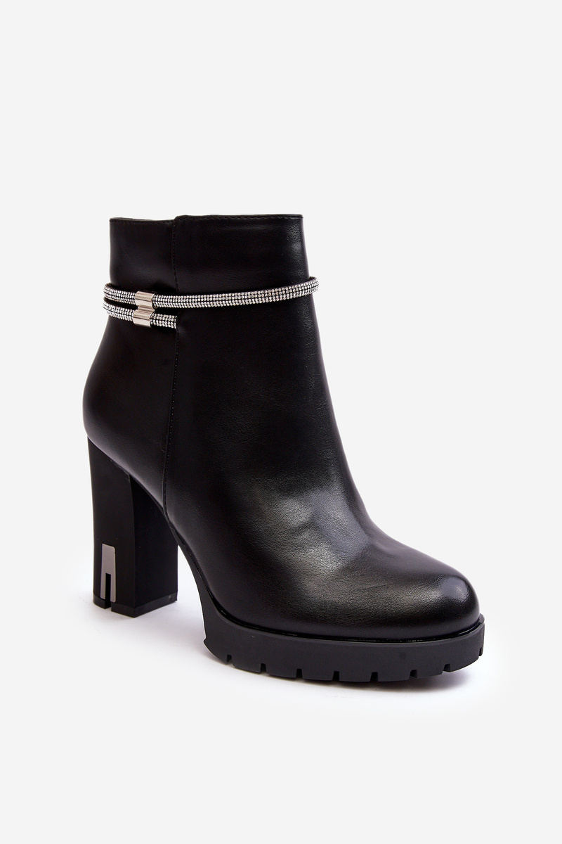 Damskie botki wykonane z eko skóry. Osadzone na platformie i obcasie w postaci słupka. Model ten zapinany jest na suwak z boku cholewki. Noski zaokrąglone. Usztywniony zapiętek. Miękka wkładka zapewni komfortowe użytkowanie obuwia. Cholewka ozdobiona paskiem z małymi, błyszczącymi cyrkoniami. Idealne do jesiennych stylizacji! Przy wyborze rozmiaru prosimy sugerować się tabelą rozmiarów.