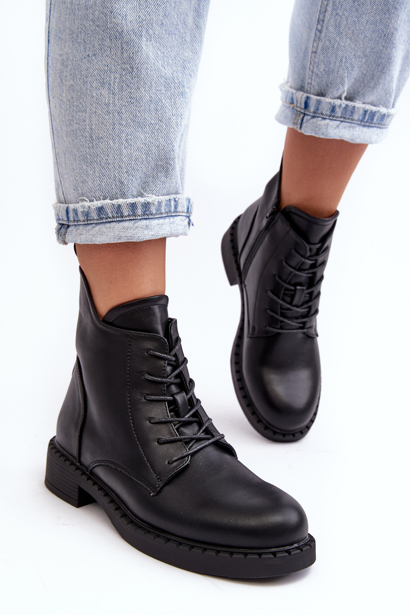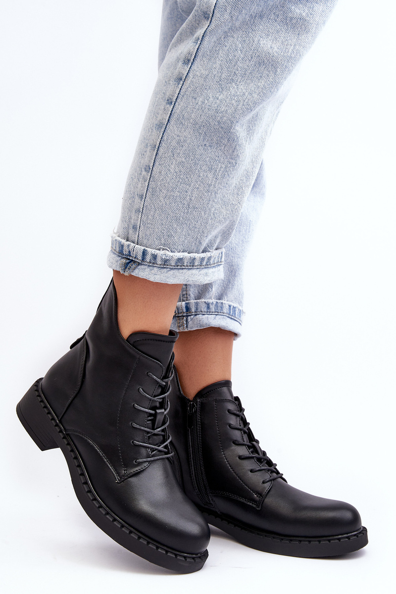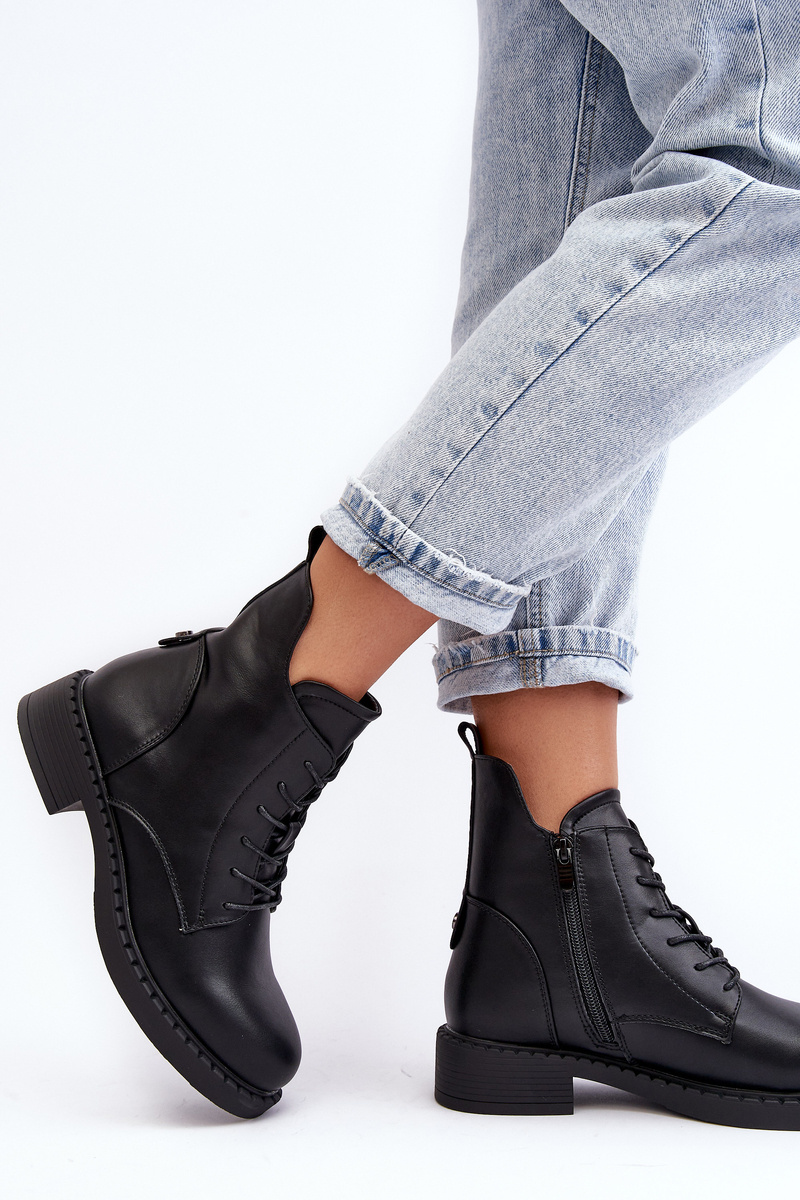 Klasyczne damskie botki na płaskim, stabilnym obcasie. Wykonane z eko skóry, Osadzone na płaskim obcasie. Cholewka za kostkę z suwakiem i sznurowaniem. Noski zaokrąglone. Środek ocieplony miłym w dotyku kocem obuwniczym. Model ten dopasujesz do wielu jesienno-zimowych stylizacji! Koniecznie powinnaś je mieć! Przy wyborze rozmiaru prosimy sugerować się tabelą rozmiarów.