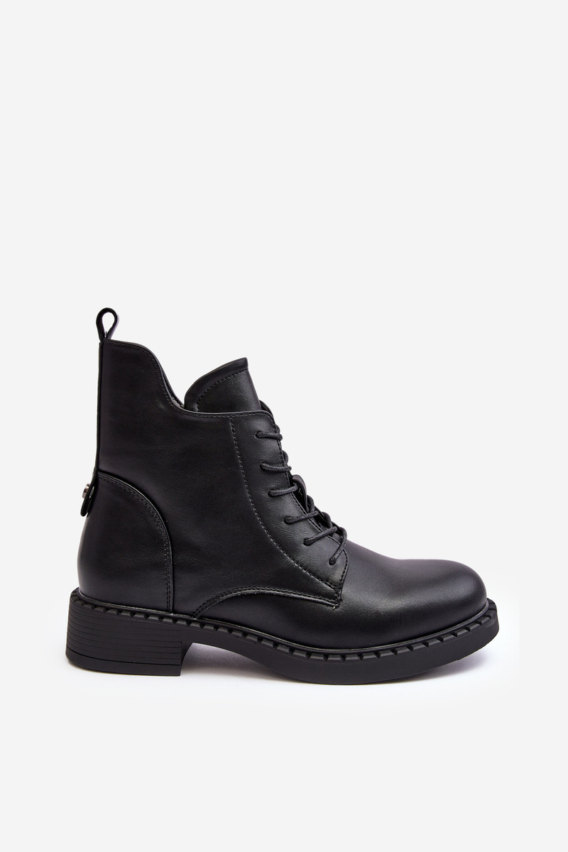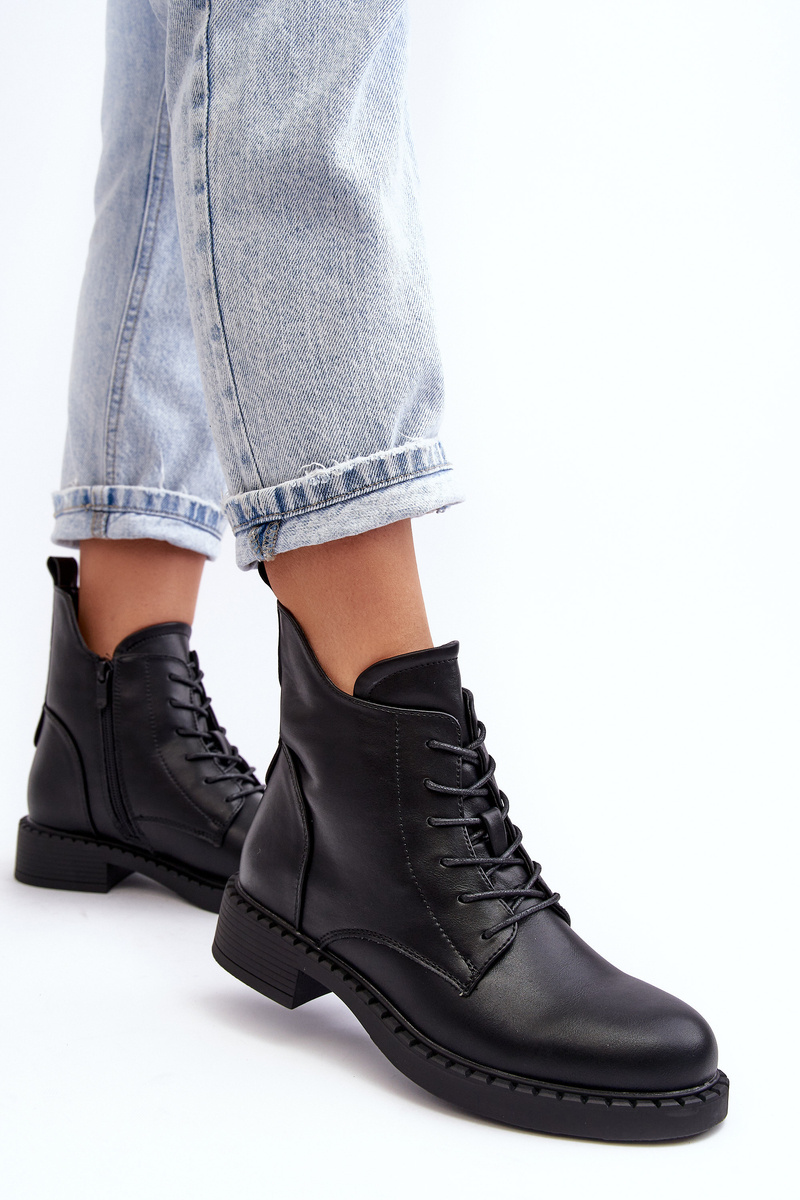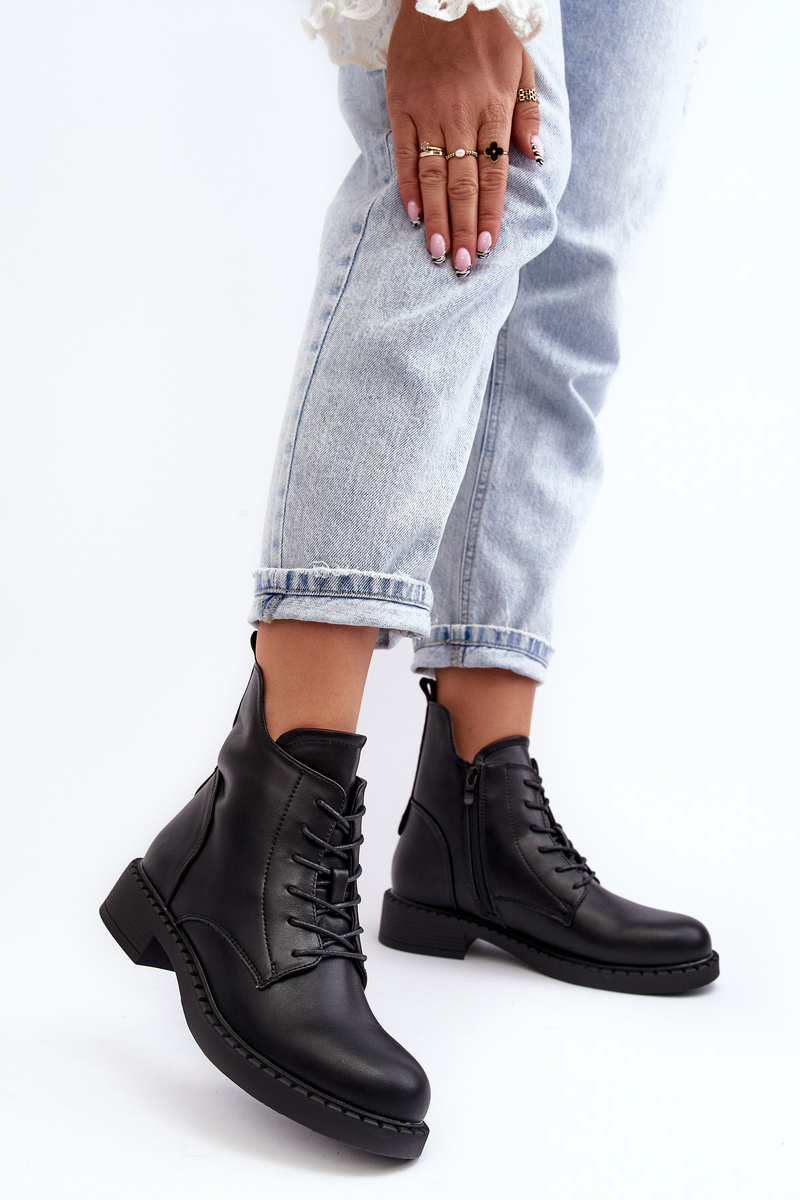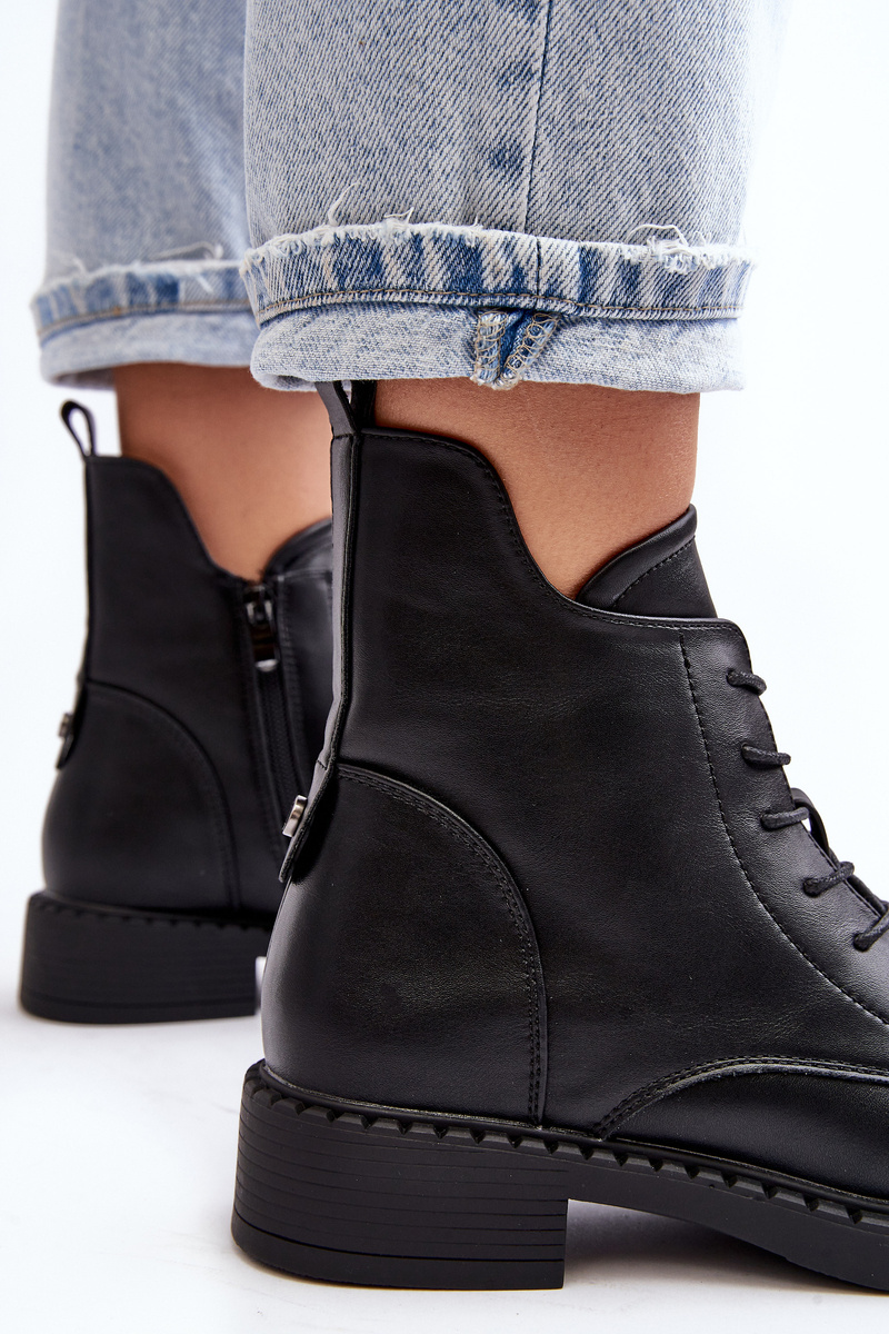 Klasyczne damskie botki na płaskim, stabilnym obcasie. Wykonane z eko skóry, Osadzone na płaskim obcasie. Cholewka za kostkę z suwakiem i sznurowaniem. Noski zaokrąglone. Środek ocieplony miłym w dotyku kocem obuwniczym. Model ten dopasujesz do wielu jesienno-zimowych stylizacji! Koniecznie powinnaś je mieć! Przy wyborze rozmiaru prosimy sugerować się tabelą rozmiarów.