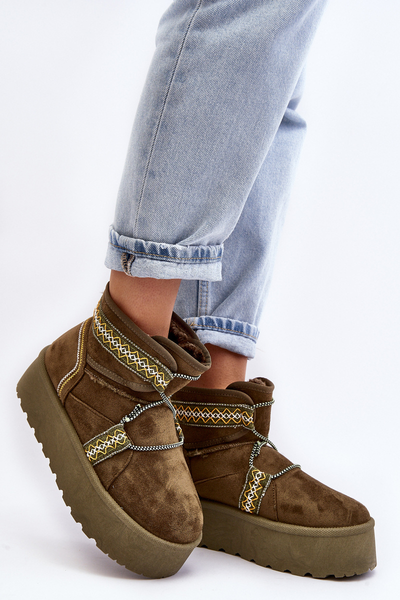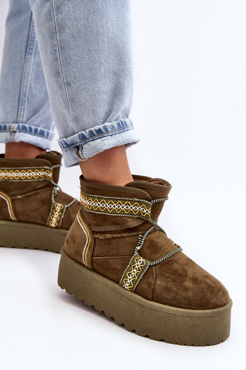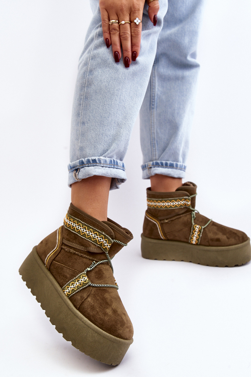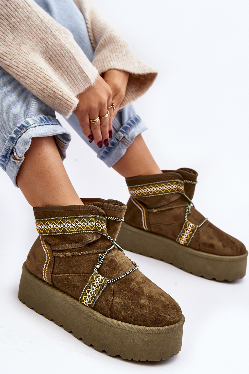Śniegowce damskie z modnym wzorem i wiązaniem na cholewce. Wykonane z eko zamszu. Osadzone na masywnej platformie z gumowego tworzywa, która świetnie odizoluje od zimnego podłoża. Cholewka za kostkę. Środek ocieplony futerkiem. Koniecznie musisz je mieć! Przy wyborze rozmiaru prosimy sugerować się tabelą rozmiarów.