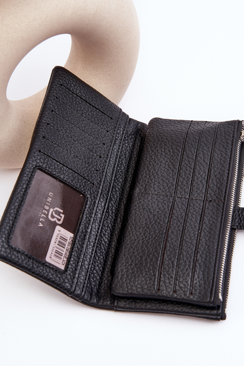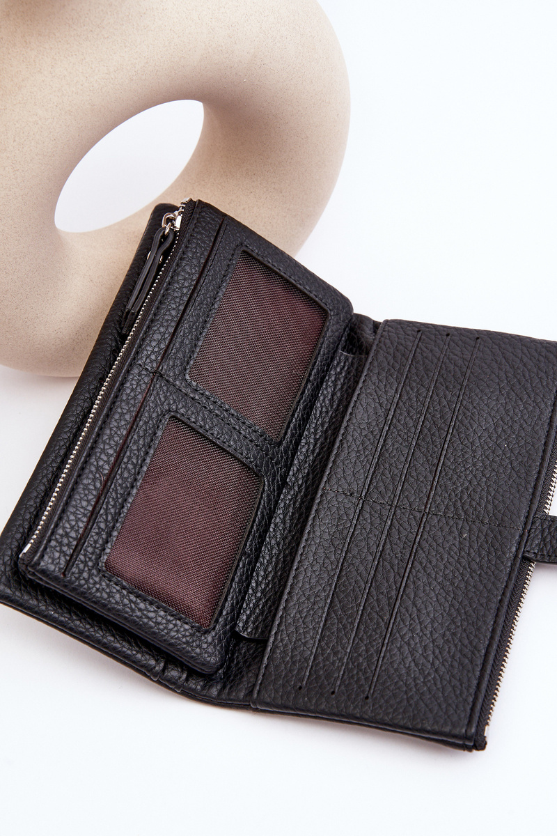 Duży, damski portfel wykonany z eko skóry. Zapinany na napę oraz zamek błyskawiczny. W środku znajdują się otwarte komory oraz jedna zamykana na suwak. Dodatkowo także portfel zawiera wiele miejsc na wizytówki czy karty kredytowe. Ten portfel z pewnością pomieści najpotrzebniejsze rzeczy!