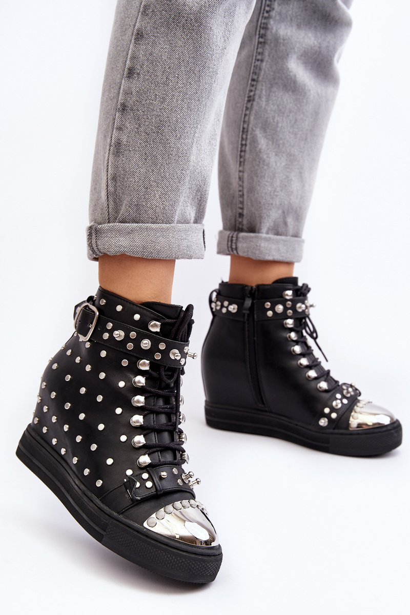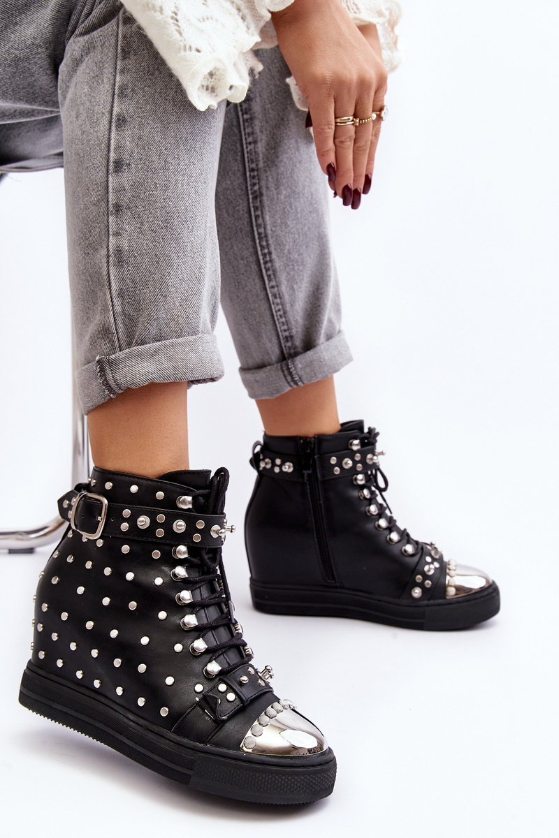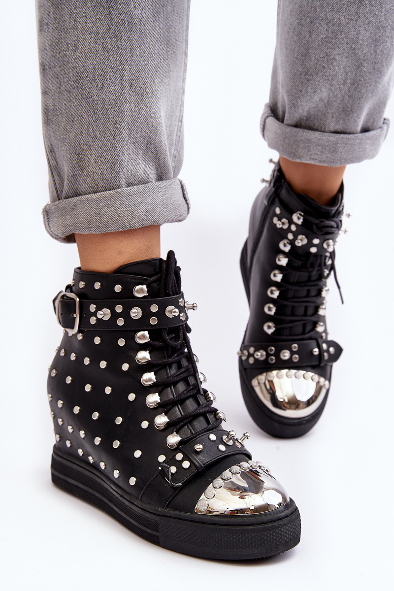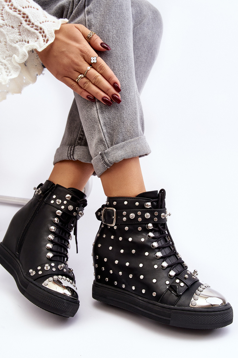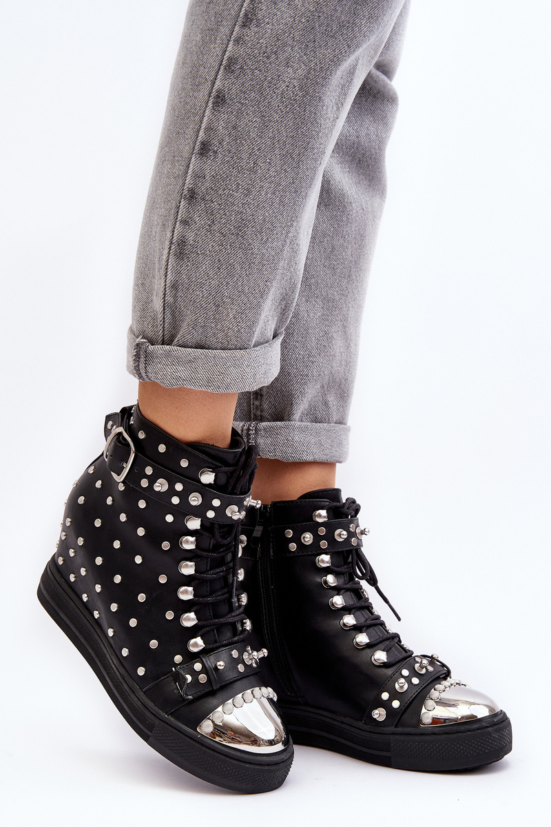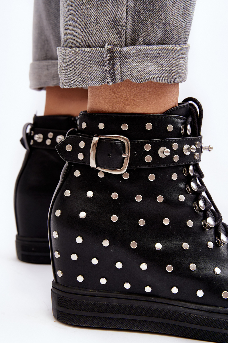 Botki damskie z cholewką za kostkę. Osadzone na ukrytym koturnie. Wykonane z eko skóry. Cholewka ozdobiona licznymi dżetami, a także paskiem z klamrą. Noski zaokrąglone. Model ten zapinany jest na suwak z boku oraz dodatkowo posiada sznurowanie. Środek ocieplony kocem obuwniczym. Przy wyborze rozmiaru prosimy sugerować się tabelą rozmiarów.