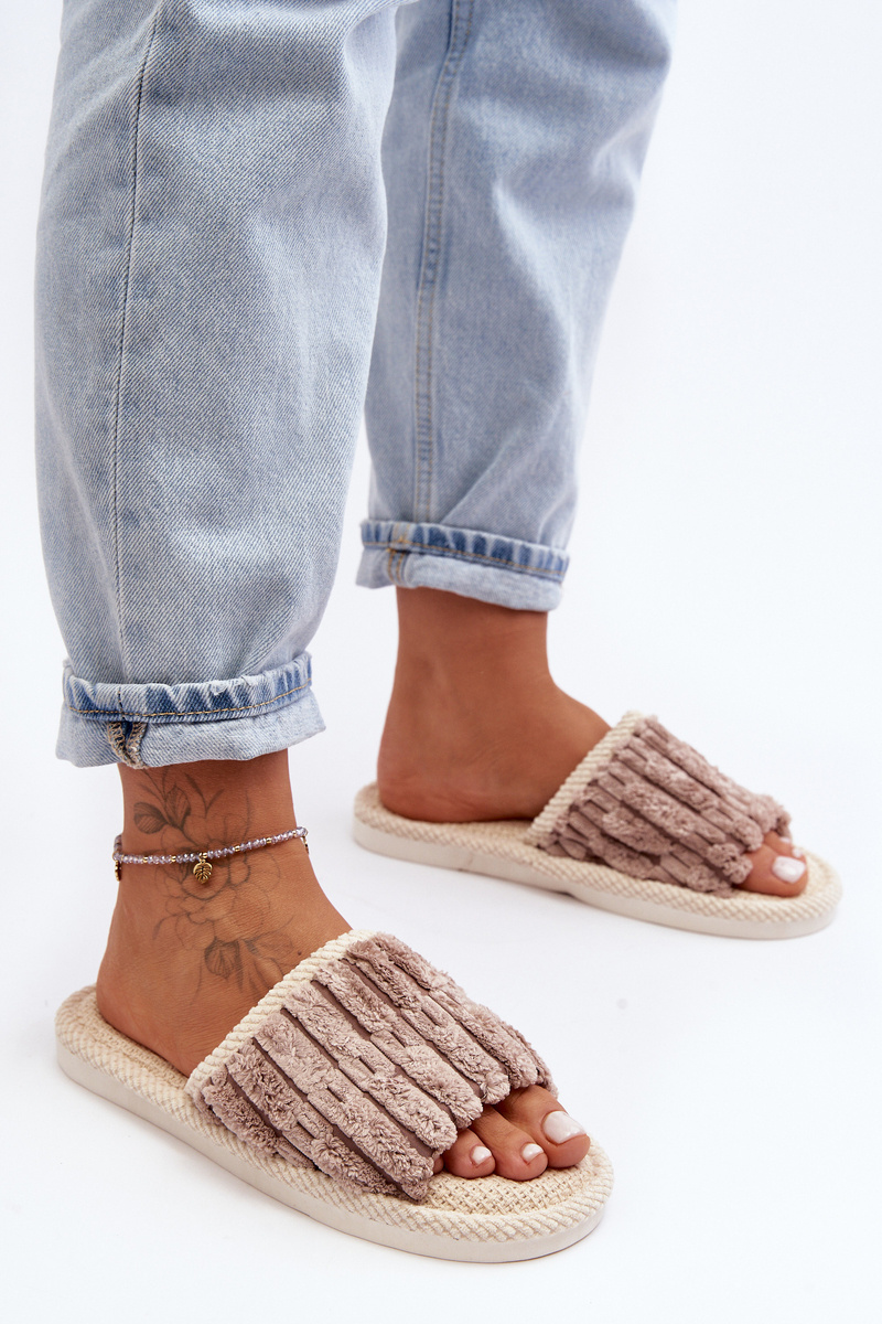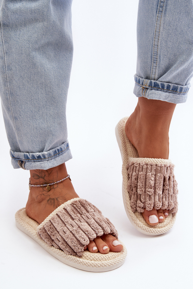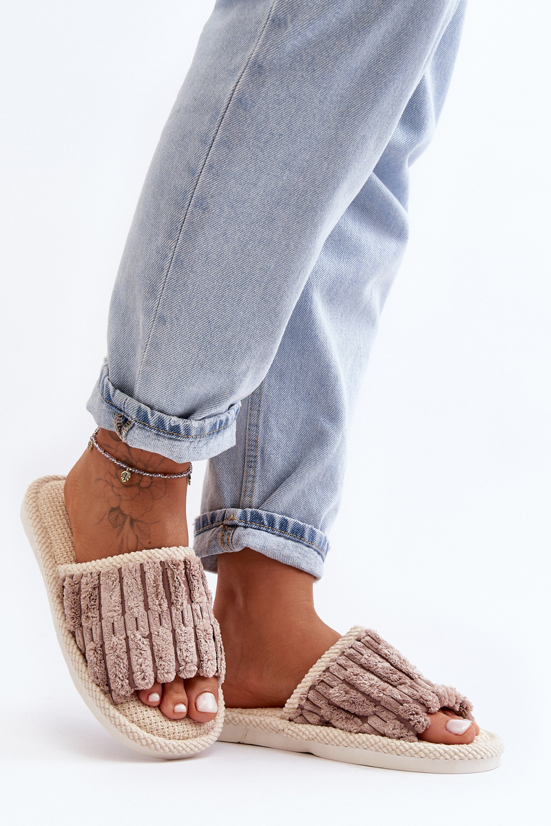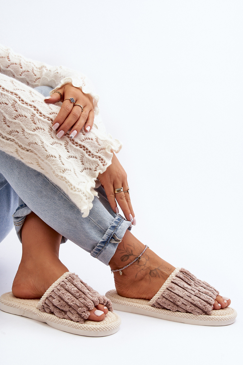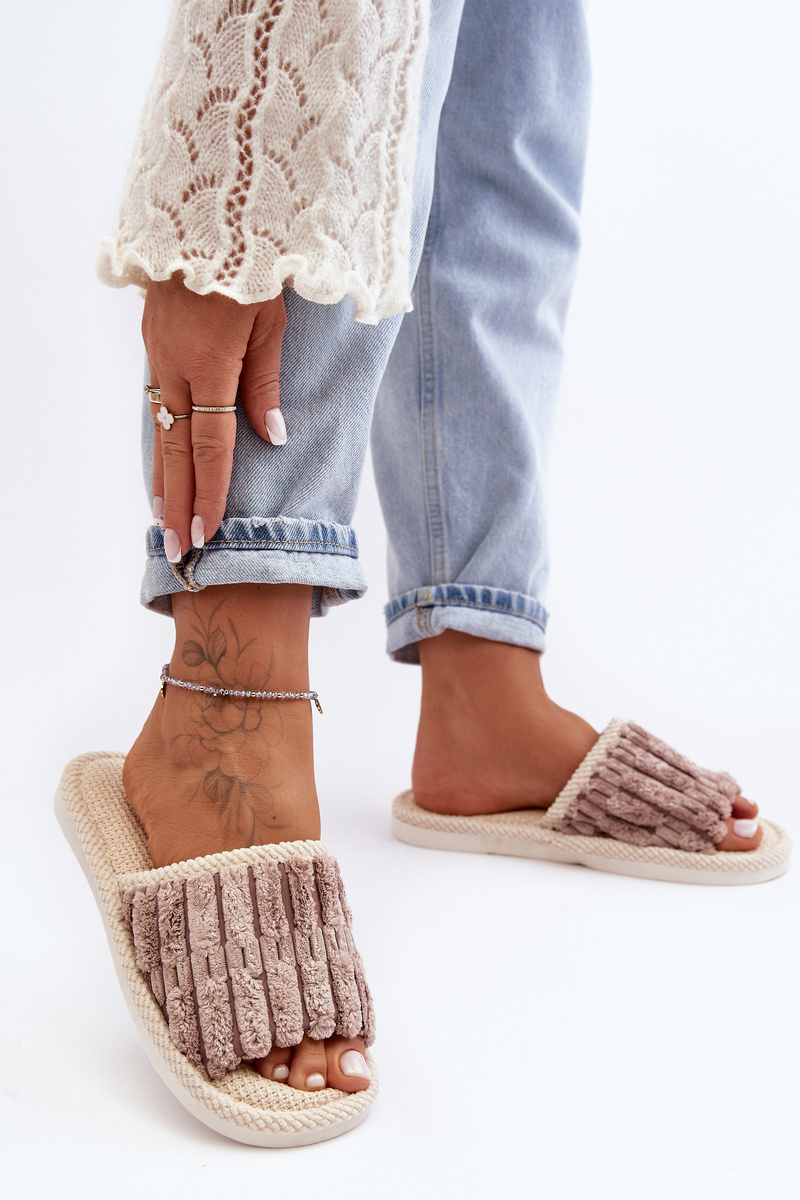 Wygodne kapcie wsuwane, z szerokim, podtrzymującym stopę paskiem. Osadzone na płaskiej podeszwie, zapewniają stabilność i komfort użytkowania. Wykonane z miłego w dotyku materiału tekstylnego. Noski odkryte. Z pewnością model ten stanie się ulubionym dodatkiem do Twojego domowego wypoczynku! Przy wyborze rozmiaru prosimy kierować się tabelą rozmiarów.