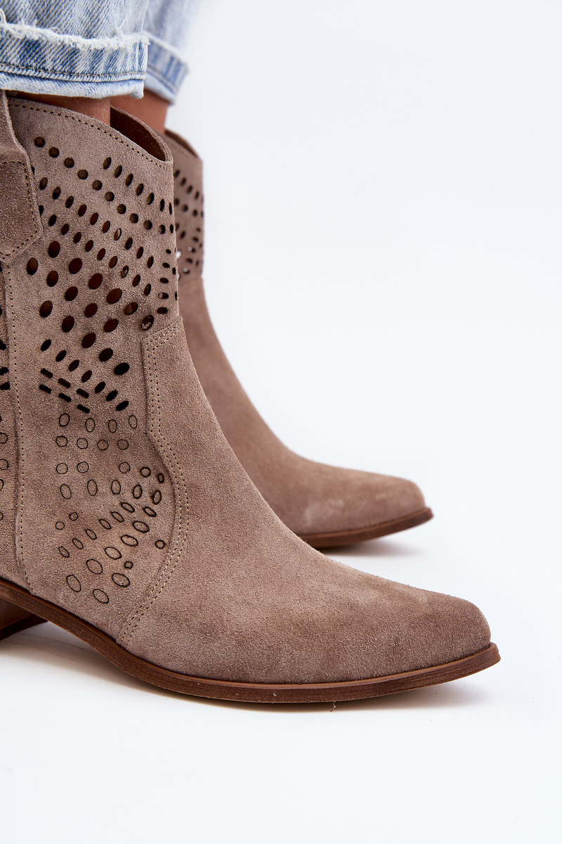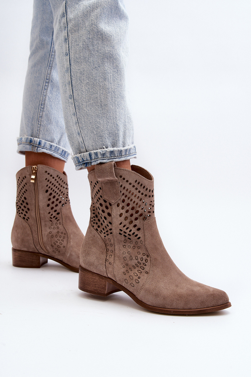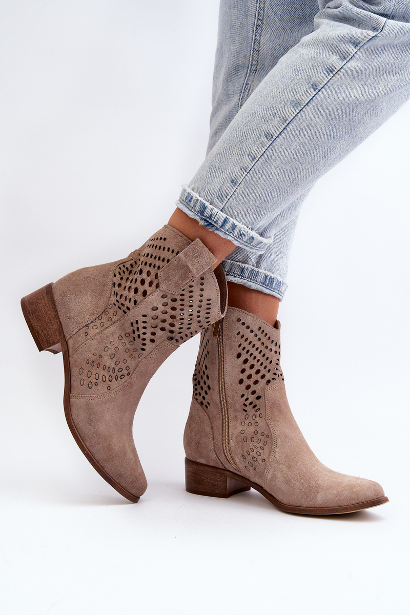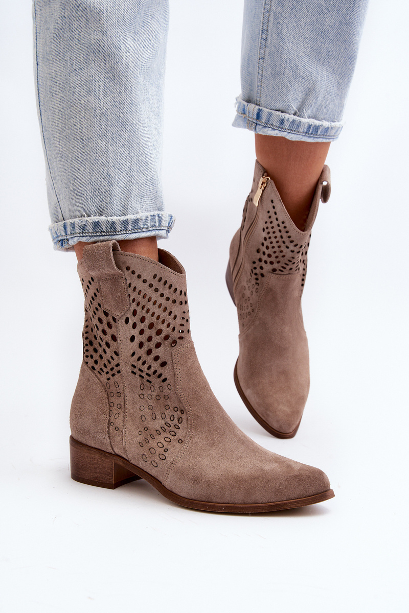 Zazoo 3305 Damskie Ażurowe Botki Kowbojki Na Niskim Obcasie Zamszowe Cappucino