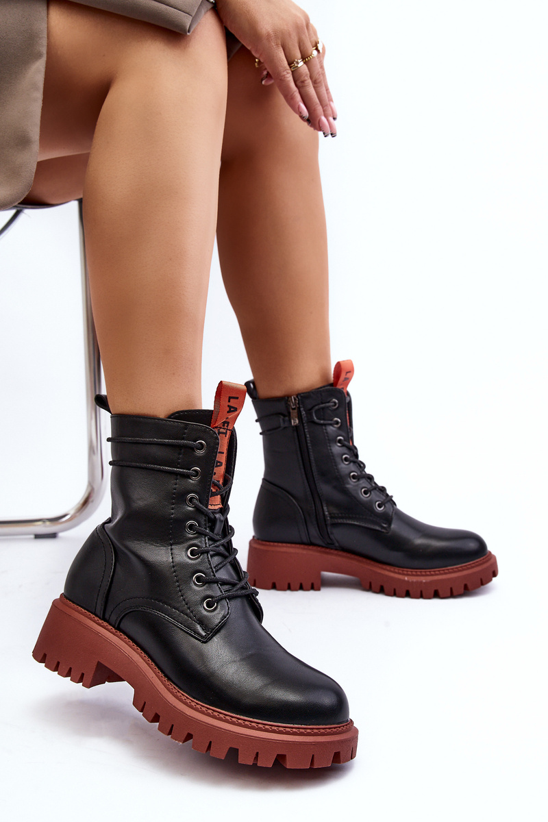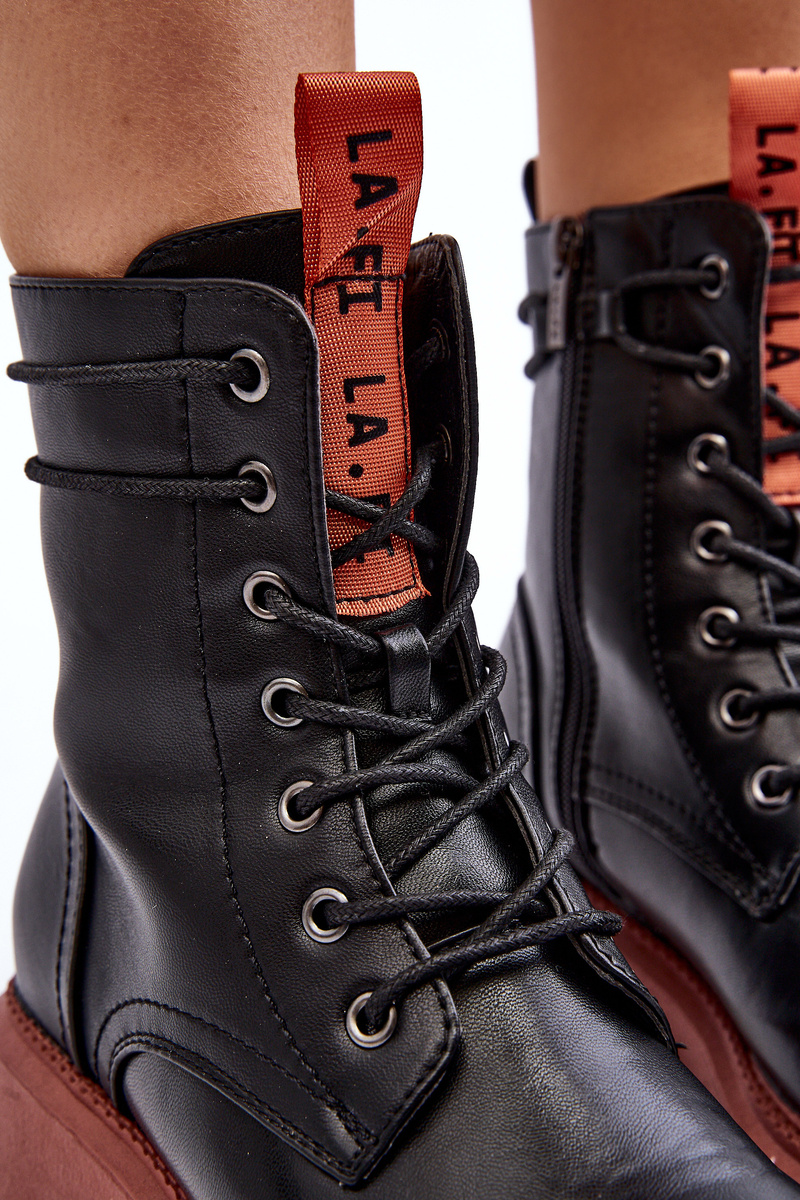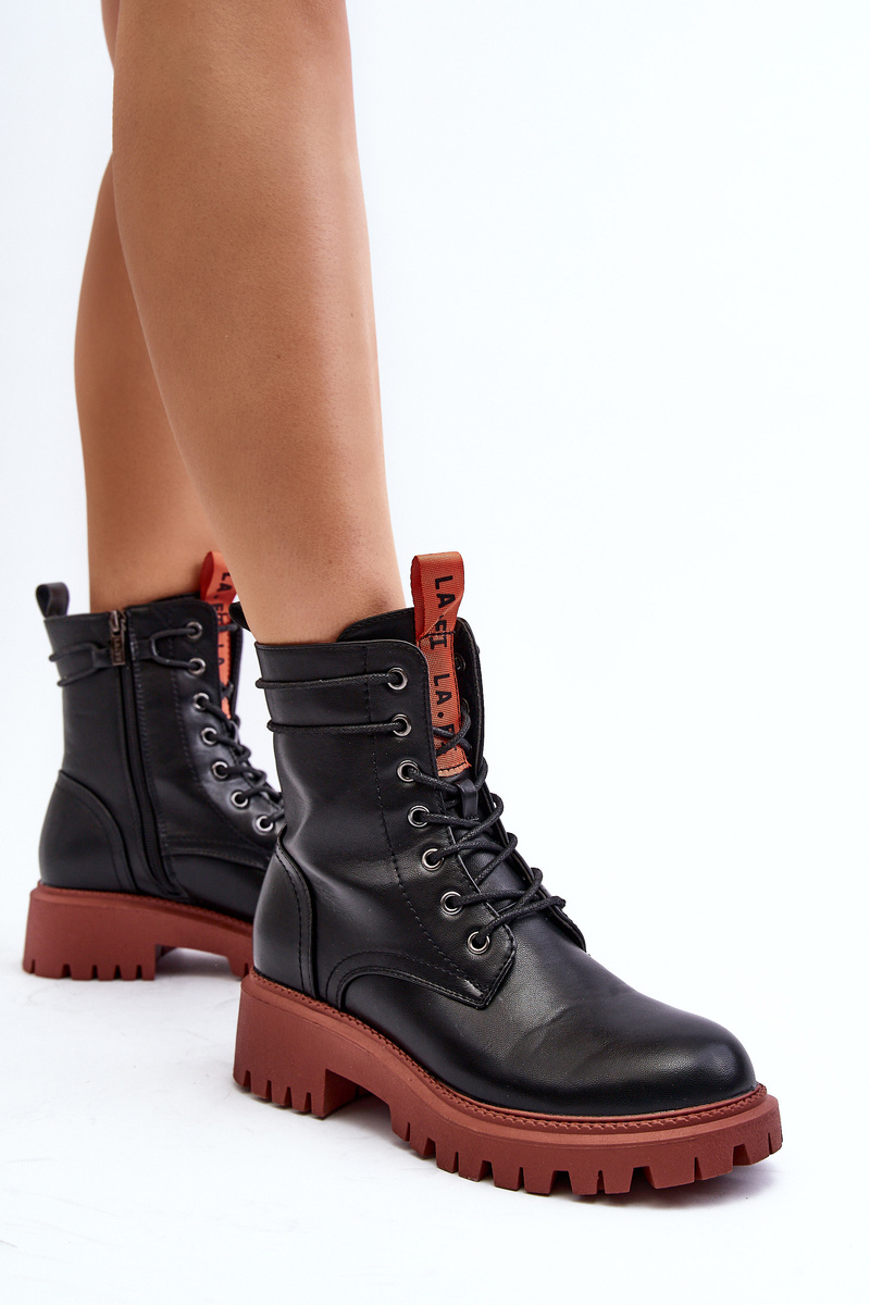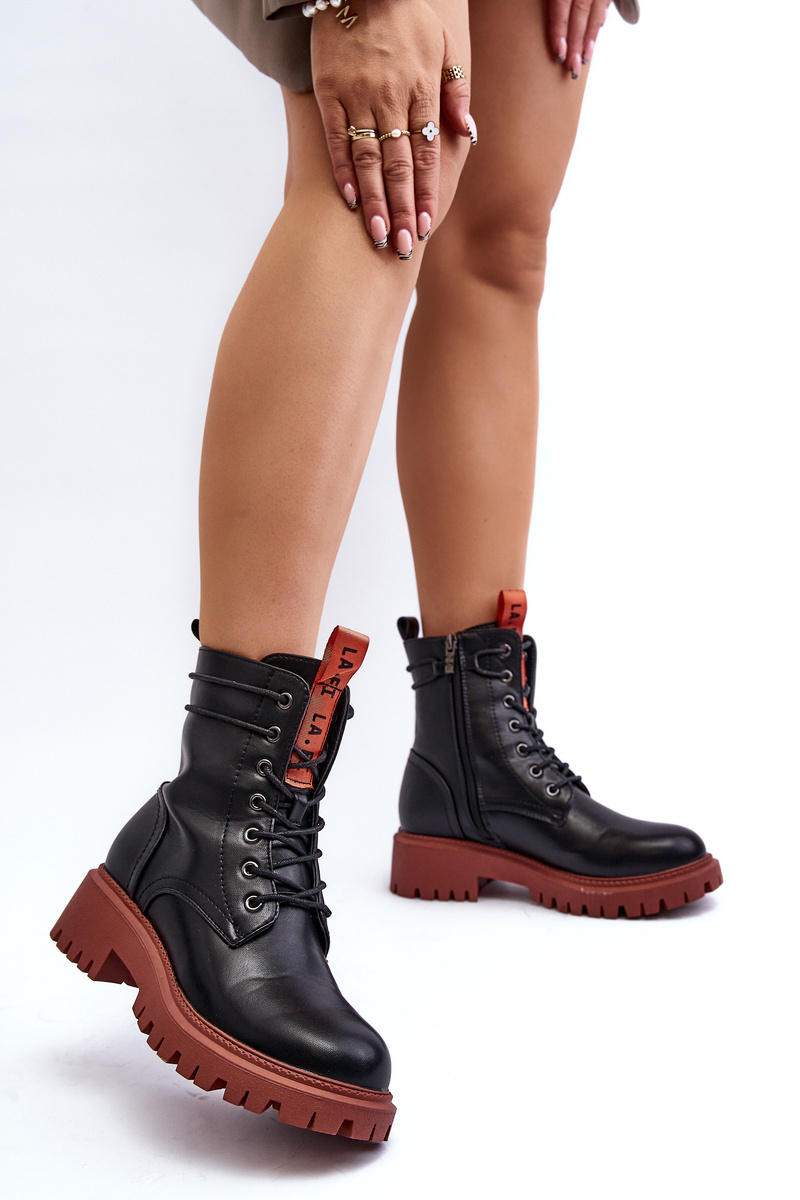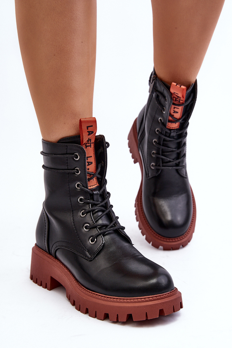 Botki damskie wykonane z eko skóry. Osadzone na płaskim obcasie i platformie z traperową podeszwą. Posiadają klasyczne sznurowanie oraz suwak z boku cholewki ułatwiający zakładanie obuwia. Dodatkowo zapiętek jest usztywniany. Ocieplone wewnątrz delikatnym futerkiem. Przy wyborze rozmiaru prosimy sugerować się tabelą rozmiarów.