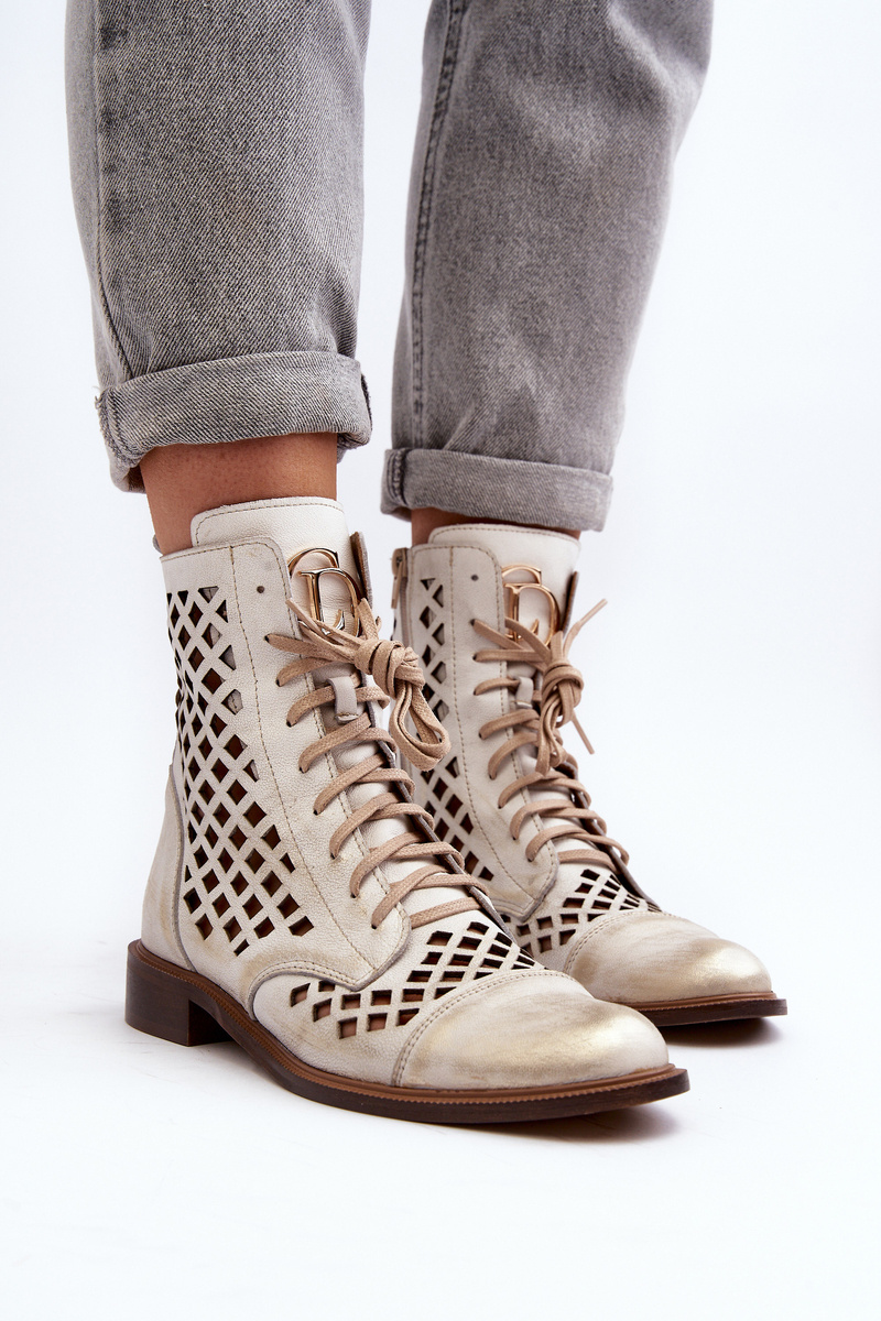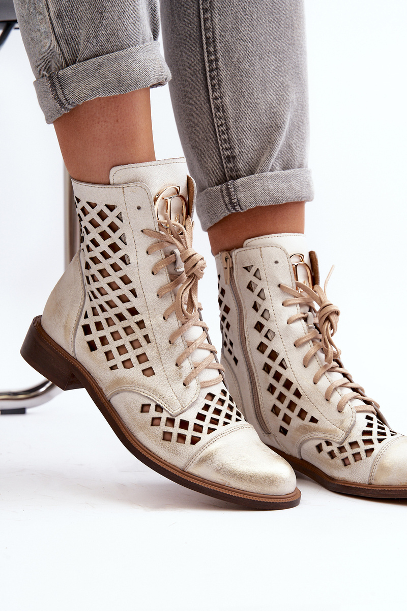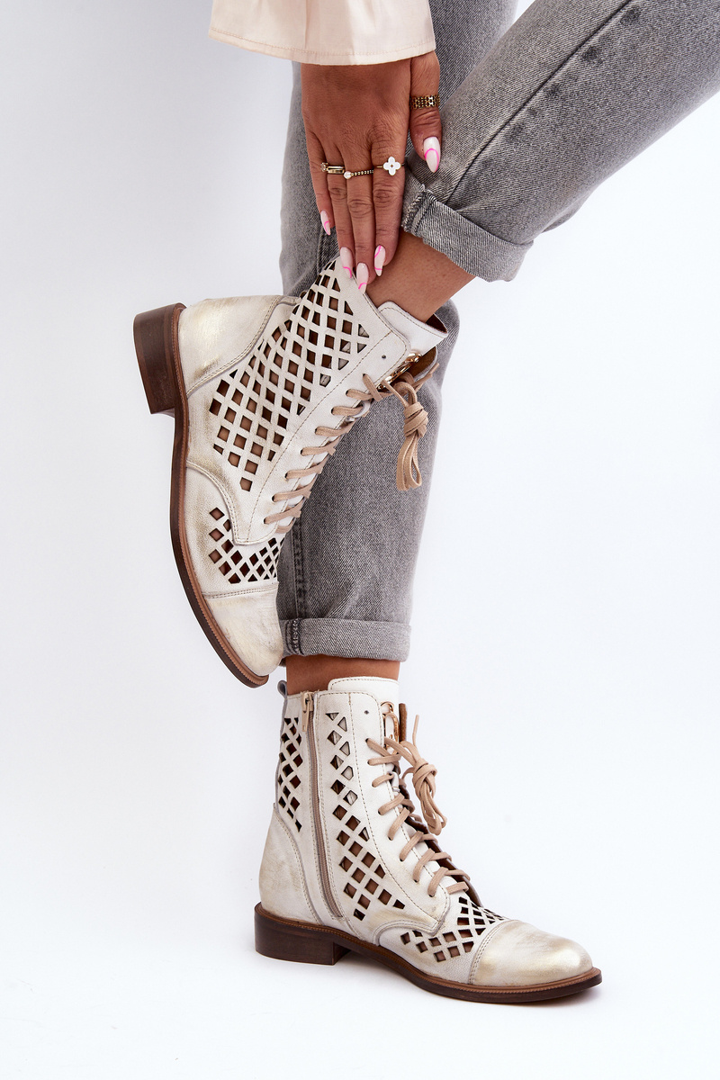 Zazoo 2695 Ażurowe Skórzane Botki Złoty Przecierany