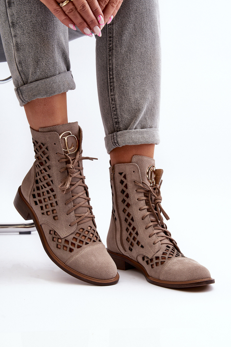 Zazoo 2695 Ażurowe Skórzane Botki Beżowe