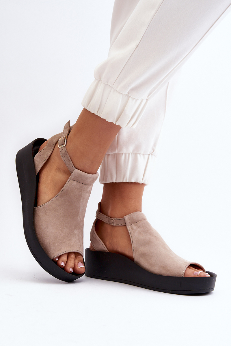 Wygodne sandały damskie to idealny wybór na letnie dni! Wykonane z naturalnego zamszu. Osadzone na platformie oraz delikatnym koturnie. Zapinane na regulowany pasek ze sprzączką. Miękka wkładka ze skóry naturalnej zapewni komfort podczas użytkowania obuwia. Idealne do każdej letniej stylizacji! Przy wyborze rozmiaru prosimy kierować się tabelą rozmiarów.
