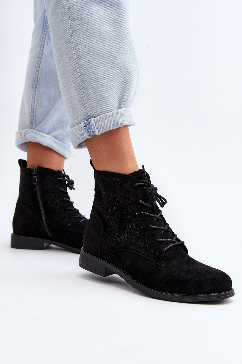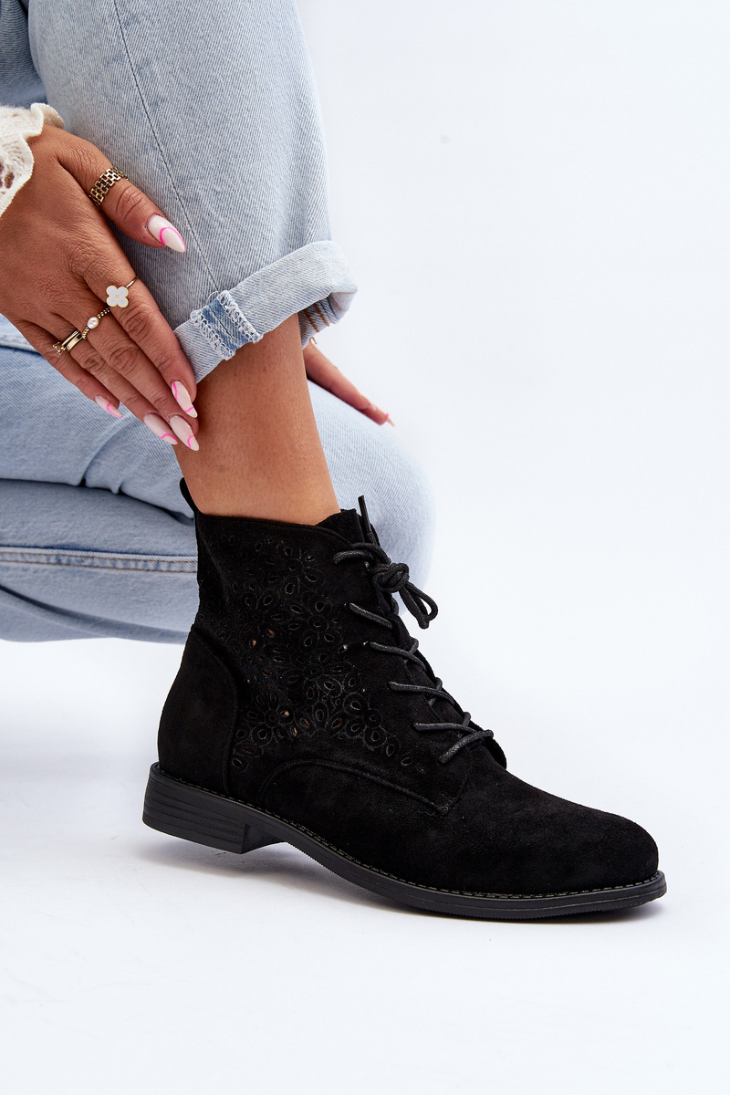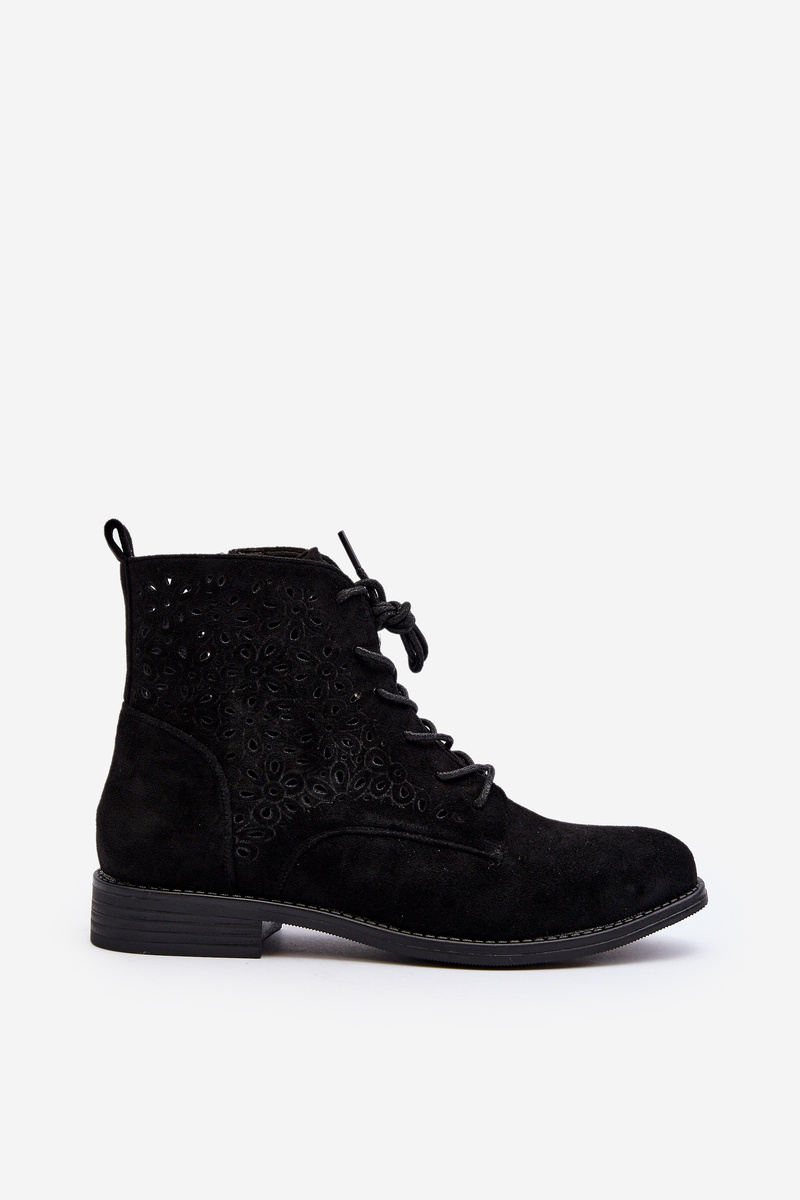 Botki damskie wykonane z eko zamszu. Ażurowa cholewka ozdobiona kwiatami. Osadzone na płaskim obcasie. Zapinane na suwak z boku oraz dodatkowo posiadają sznurowanie, co umożliwi lepsze dopasowanie. Noski zaokrąglone. Dodatkowo model ten posiada usztywniony zapiętek. Koniecznie sprawdź także pozostałe modele botków dostępnych w naszej ofercie! Przy wyborze rozmiaru prosimy sugerować się tabelą rozmiarów.
