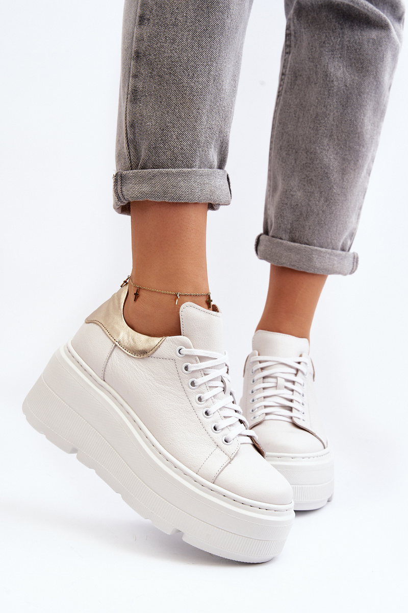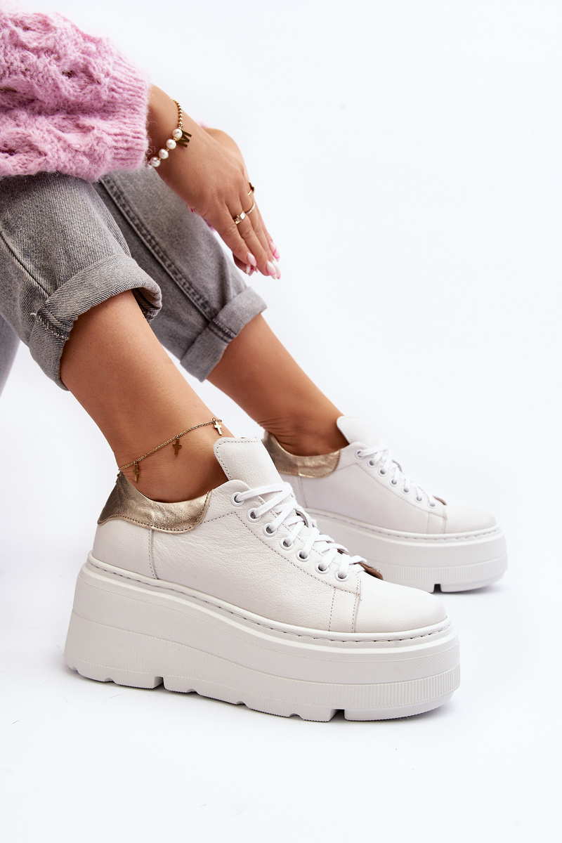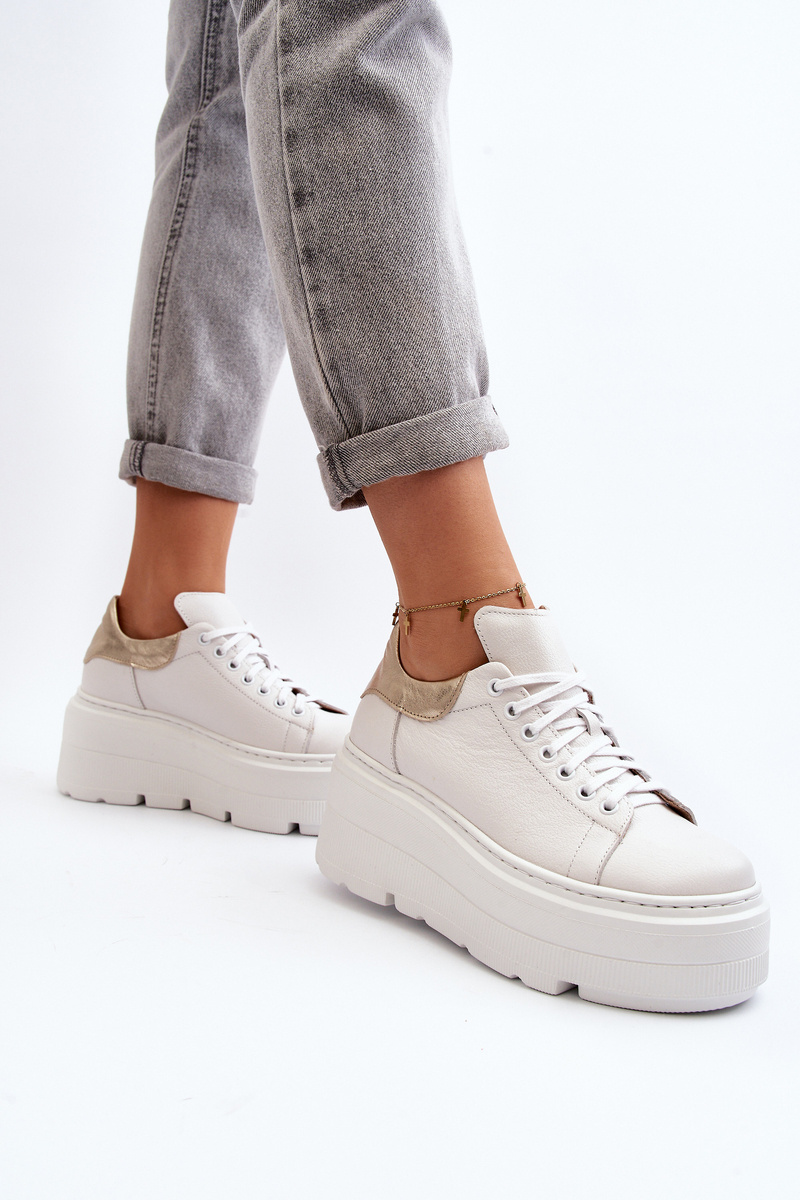Buty sportowe damskie wykonane ze skóry naturalnej. Masywna platforma sprawia, że prezentują się niezwykle stylowo. Skórzana wkładka zapewni komfort podczas użytkowania. Noski zaokrąglone. Doskonale sprawdzą się w codziennych stylizacjach! Przy wyborze rozmiaru prosimy kierować tabelą rozmiarów.
