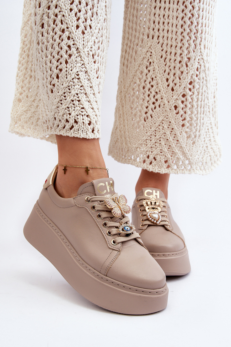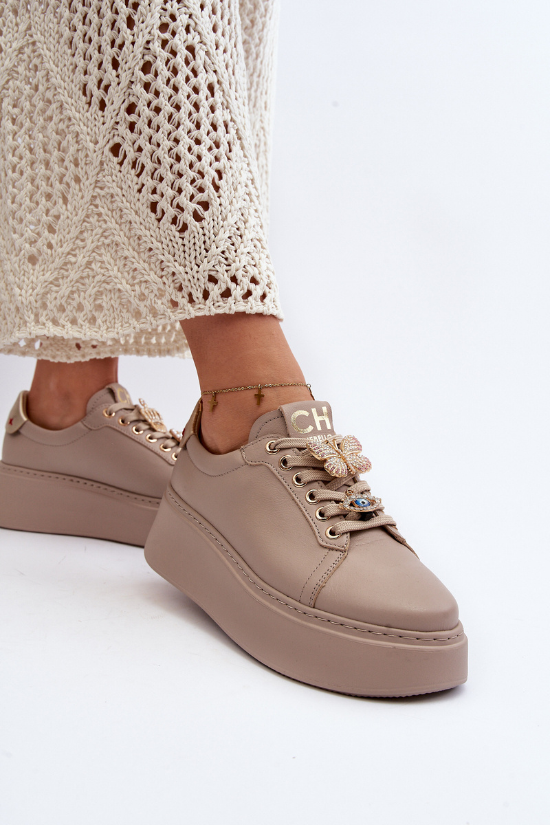Damskie Skórzane Sneakersy Z Ozdobami CheBello 4292 Beżowe