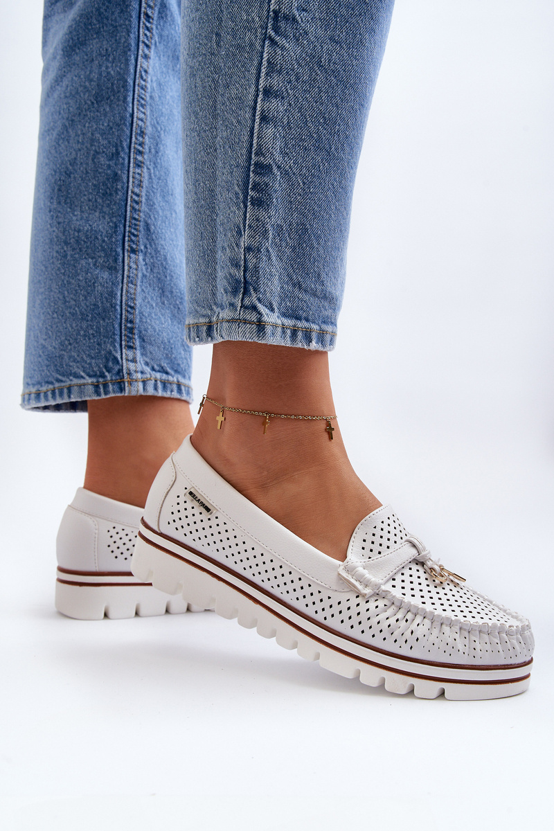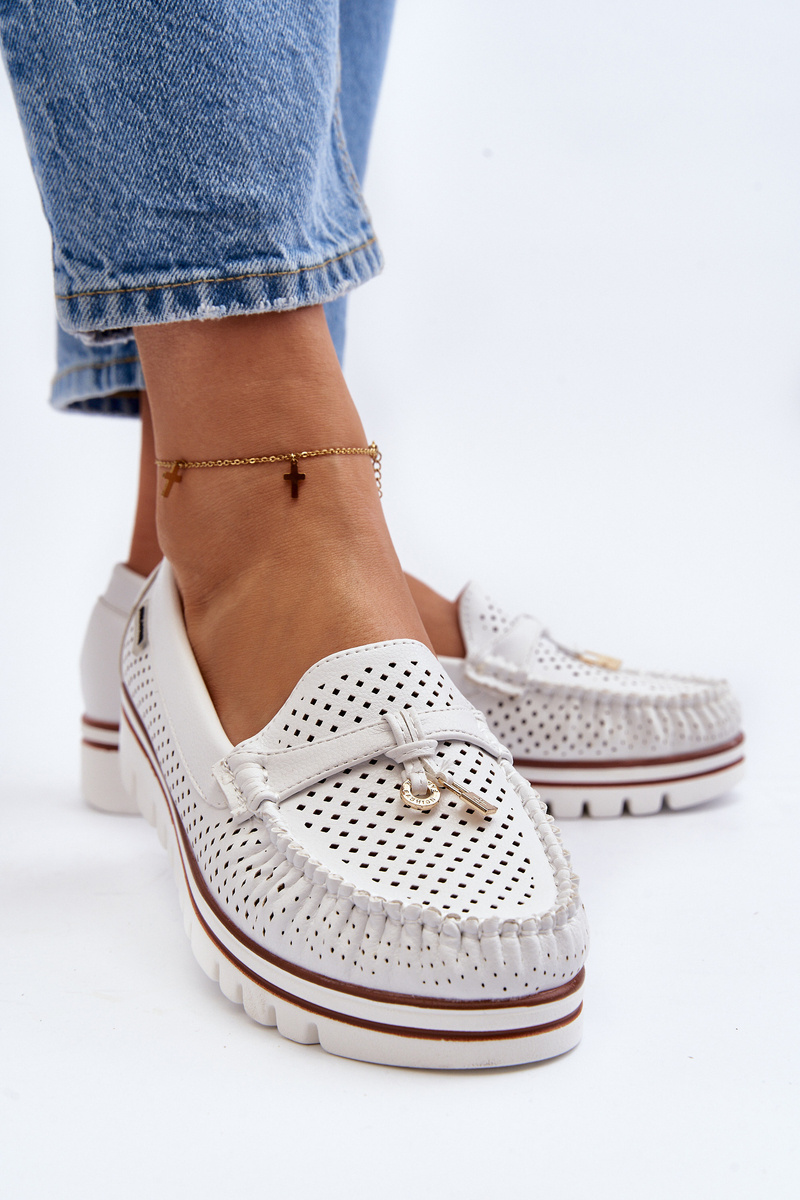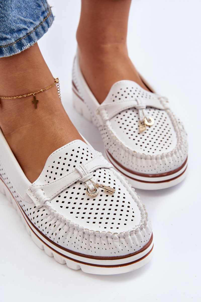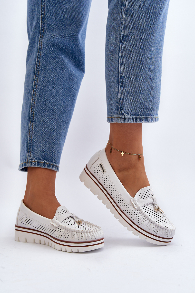 Ażurowe mokasyny wykonane z eko skóry. Osadzone na platformie. Miękka wkładka ze skóry naturalnej zapewni wygodę podczas noszenia. Świetny model do wielu wiosenno-letnich stylizacji! Przy wyborze rozmiaru prosimy sugerować się tabelą rozmiarów.